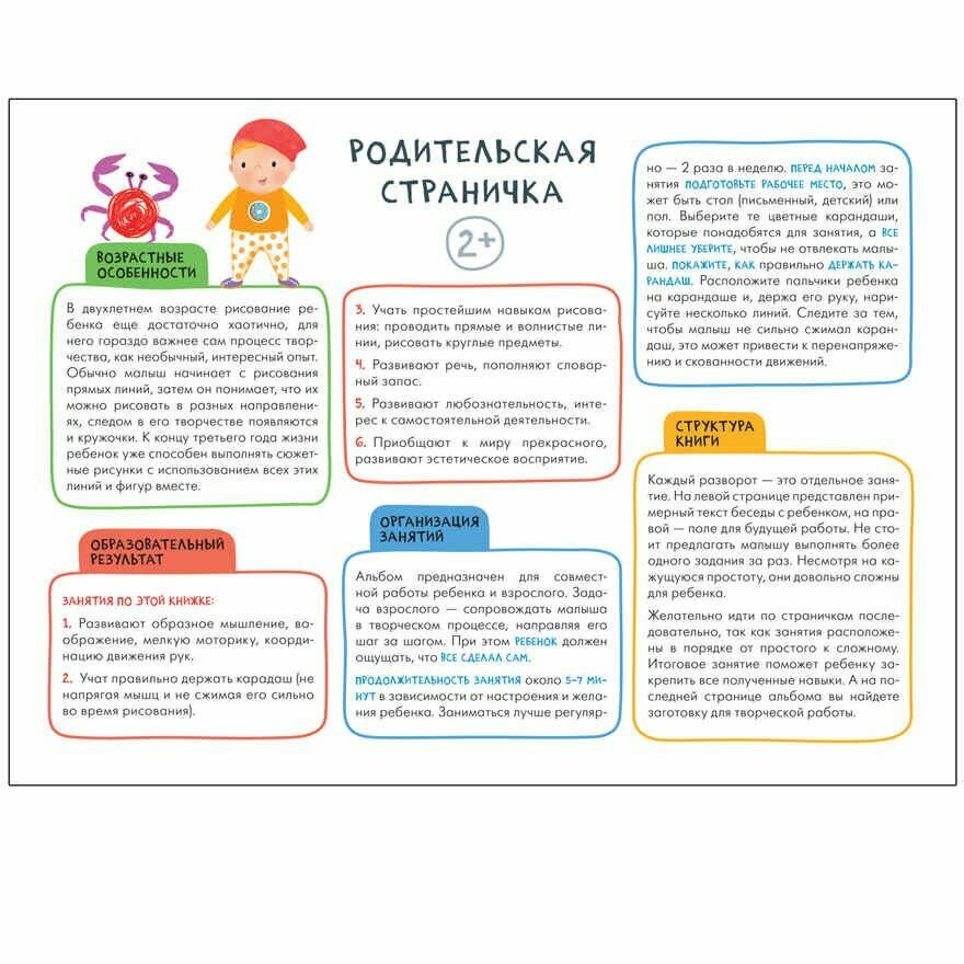 Все задания в книгах выстроены от простого к сложному и следуют принципу «развитие через игру». Заниматься с ребенком может любой взрослый, специальных знаний и опыта не требуется. Родительская страничка в каждой книге подскажет, что, как и почему нужно развивать в данном возрасте.