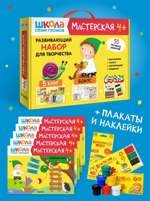 «Развивающий набор для творчества 4+» — это 55 готовых занятий для ребенка от 4 до 5 лет. В Мастерской собраны все основные виды творческой деятельности, доступные малышу: лепка, рисование, аппликация, поделки, а также необходимые материалы: пластилин, карандаши и краски. Кроме того, внутри набора ждет приятный бонус — большой плакат (70Х50 см) для раскрашивания по цифрам и буквам, разработанный в соответствии с возрастными возможностями ребенка, обучающий плакат «Арифметика цвета» и поощрительные наклейки.