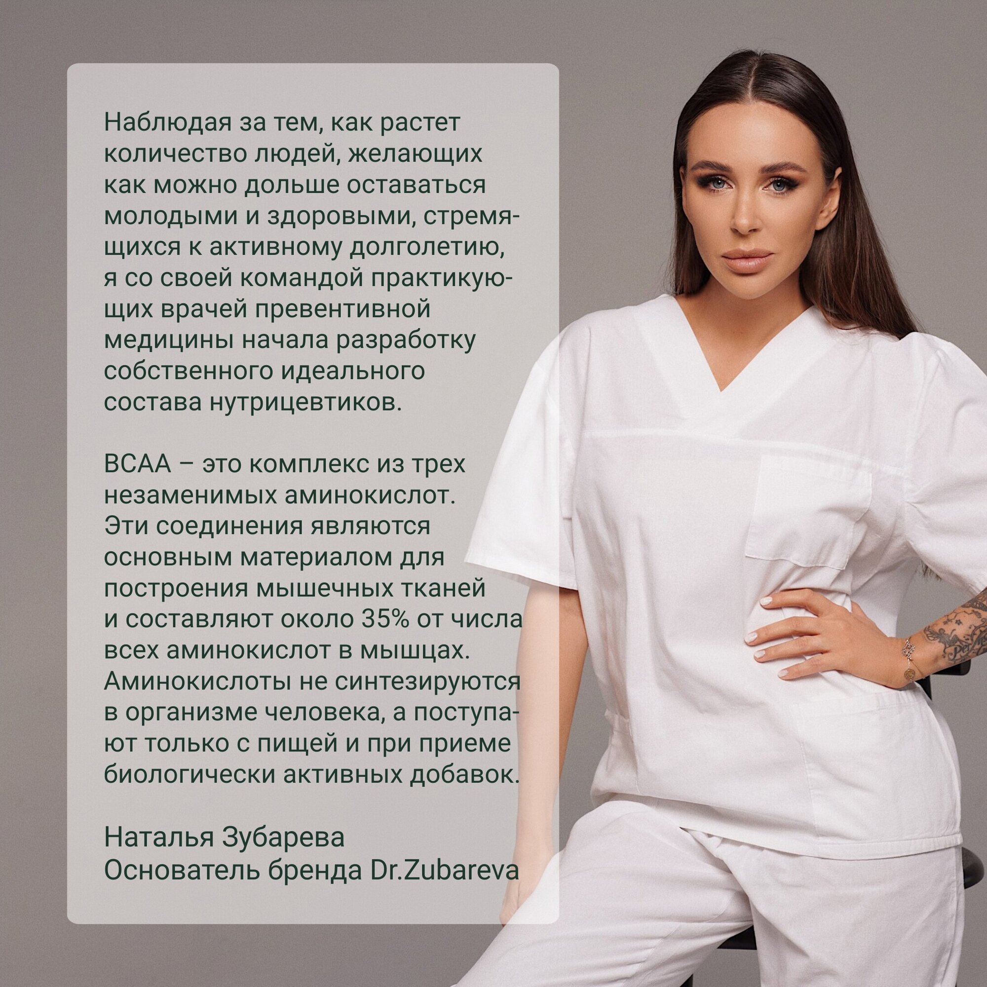 ВСАА — одна из самых популярных спортивных биологически активных добавок.ВСАА — комплекс из незаменимых аминокислот (L-Лейцин, L-Валин, L-Изолейцин), которые активно работают над восстановлением мышц, а также способствуют сжиганию жира.Когда нужен комплекс ВСАА?При похудении. Организм во время соблюдения диеты находится в состоянии стресса и испытывает острую нехватку энергии. Для обеспечения энергией мышечные волокна могут начать расщепляться. ВСАА в этом случае становится источником энергии, не позволяя организму использовать аминокислоты из мышц.При наборе мышечной массы. ВСАА усиливают синтез белка за счет положительного влияния на выработку инсулина, который в свою очередь ускоряет доставку аминокислот в кровь.Для быстрого восстановления. При применении ВСАА быстрее проходит мышечная боль, восстановление между тренировками происходит быстрее и легче.При регулярном приеме нутрицевтик способен:предохранить мышцы от катаболизма;уменьшить мышечную боль;повысить выносливость организма;обеспечить быстрый рост мышц;укрепить иммунную систему;нормализовать аминокислотный баланс.ВСАА от Dr.Zubareva — это:Уникальная форма и оптимальная порция — шот 100 мл.Приятный вкус — малина.Увеличенная концентрация активных веществ, обеспечивающая быструю усвояемость. Состав, разработанный практикующим врачом превентивной медицины Натальей Зубаревой.Нутрицевтик соответствует мировым стандартам качества: производится из качественного сырья и проходит контроль качества с лабораторным подтверждением на каждом этапе производства."