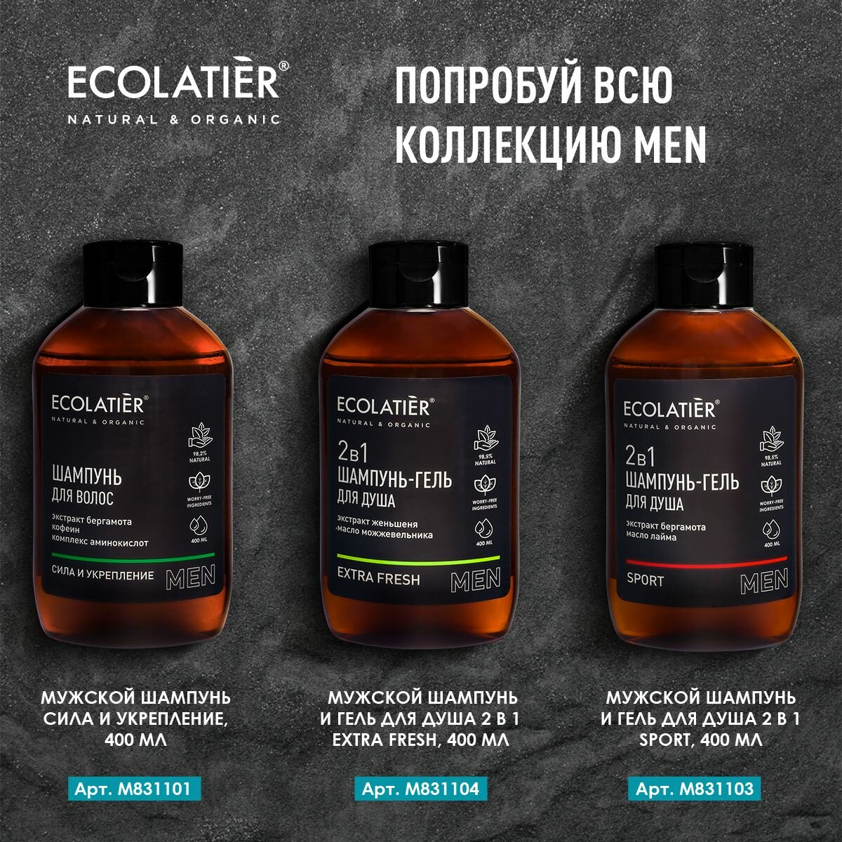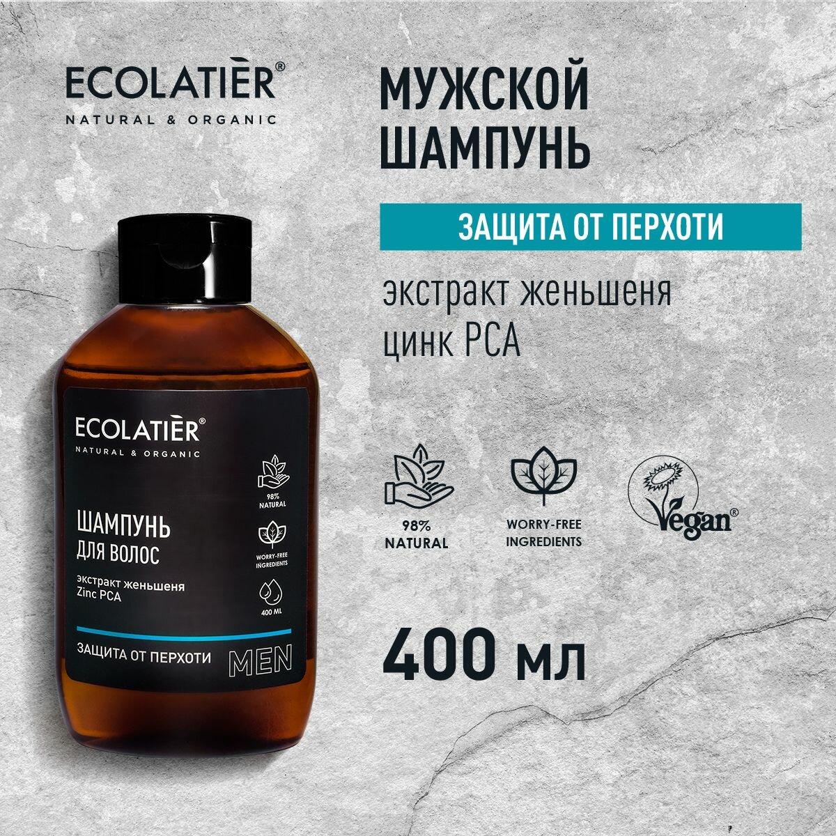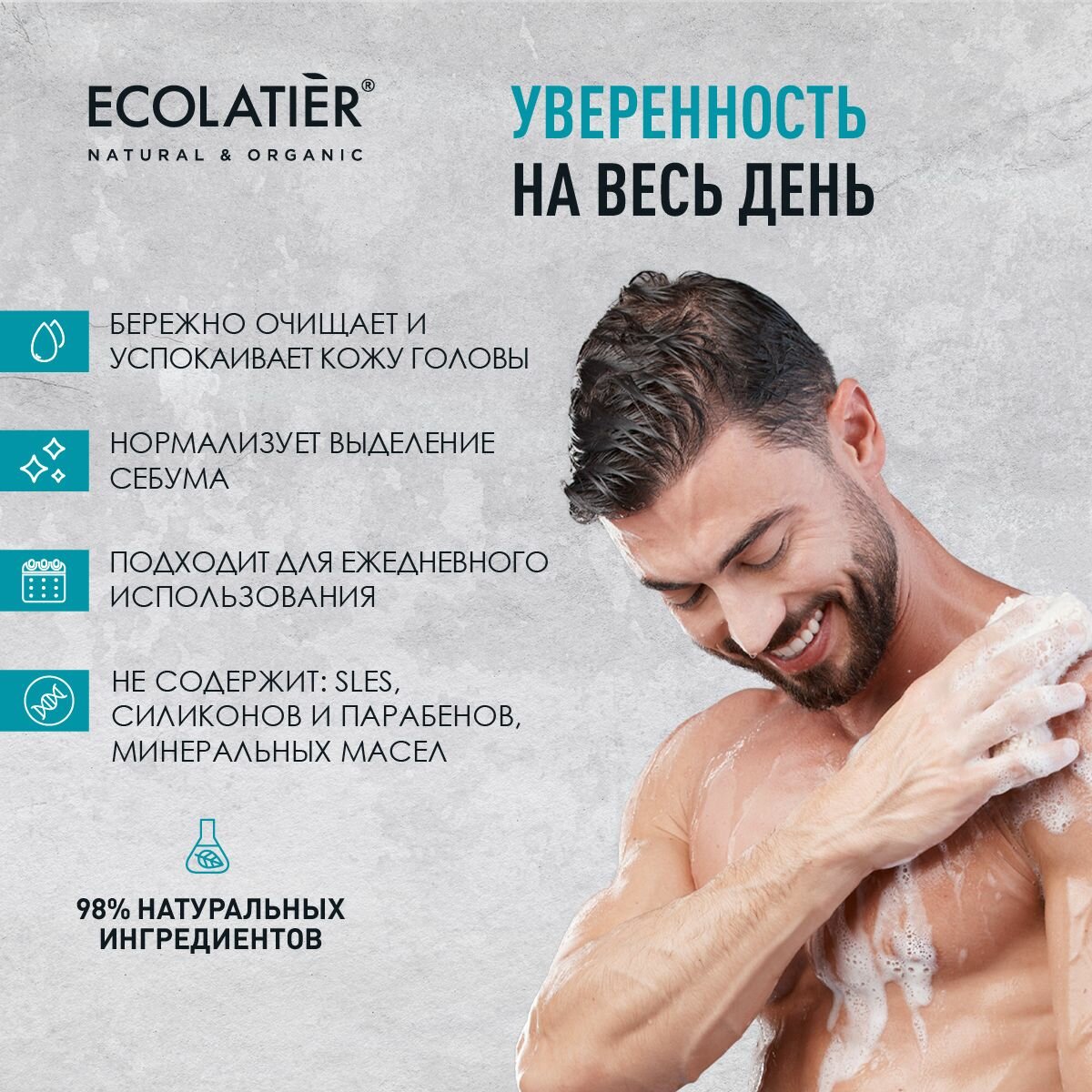 Шампунь Защита от перхоти ECOLATIER® MEN деликатно очищает волосы и кожу головы, нормализует работу сальных желез, уменьшает шелушение и препятствует появлению перхоти. Сохраняет ощущение чистоты и свежести на весь день.