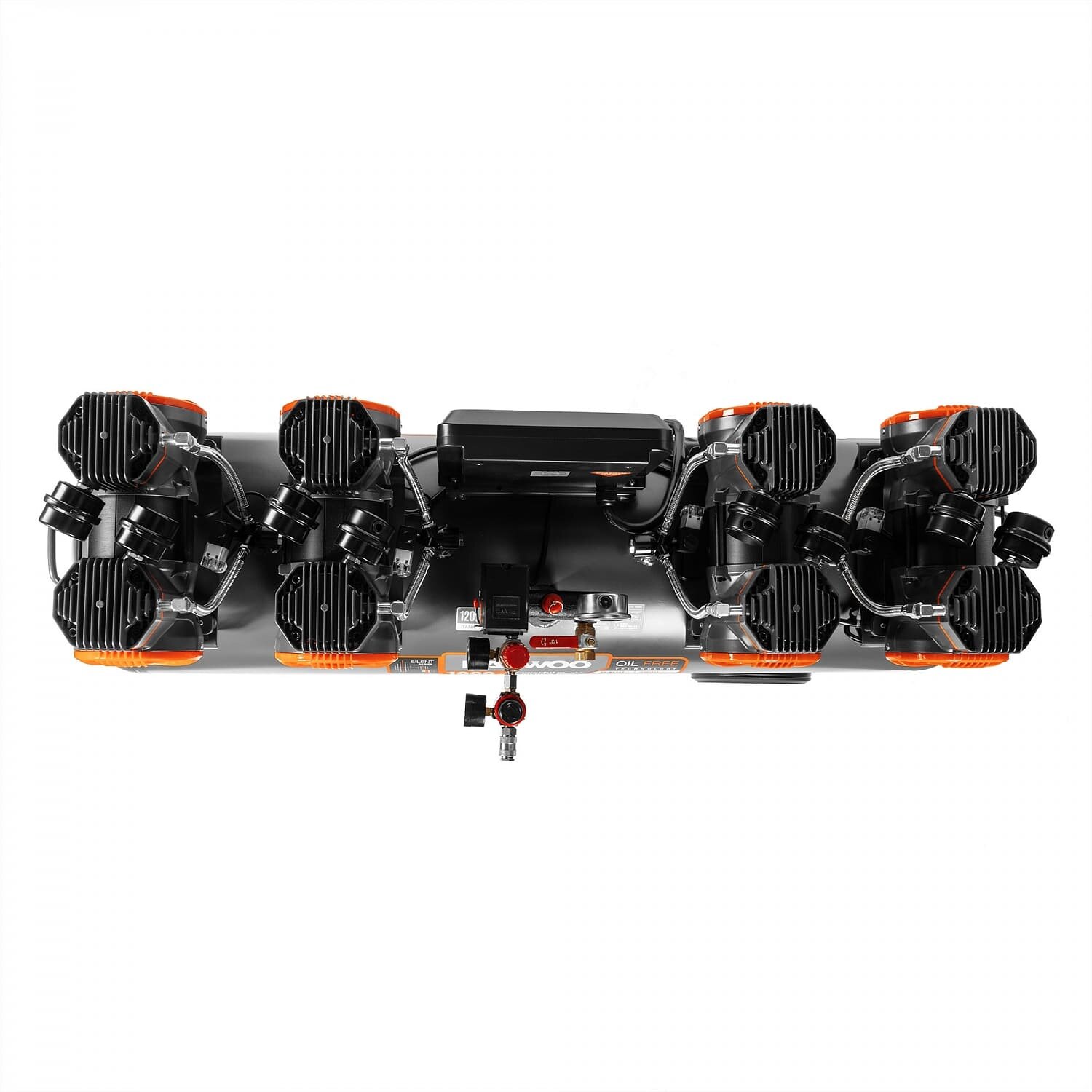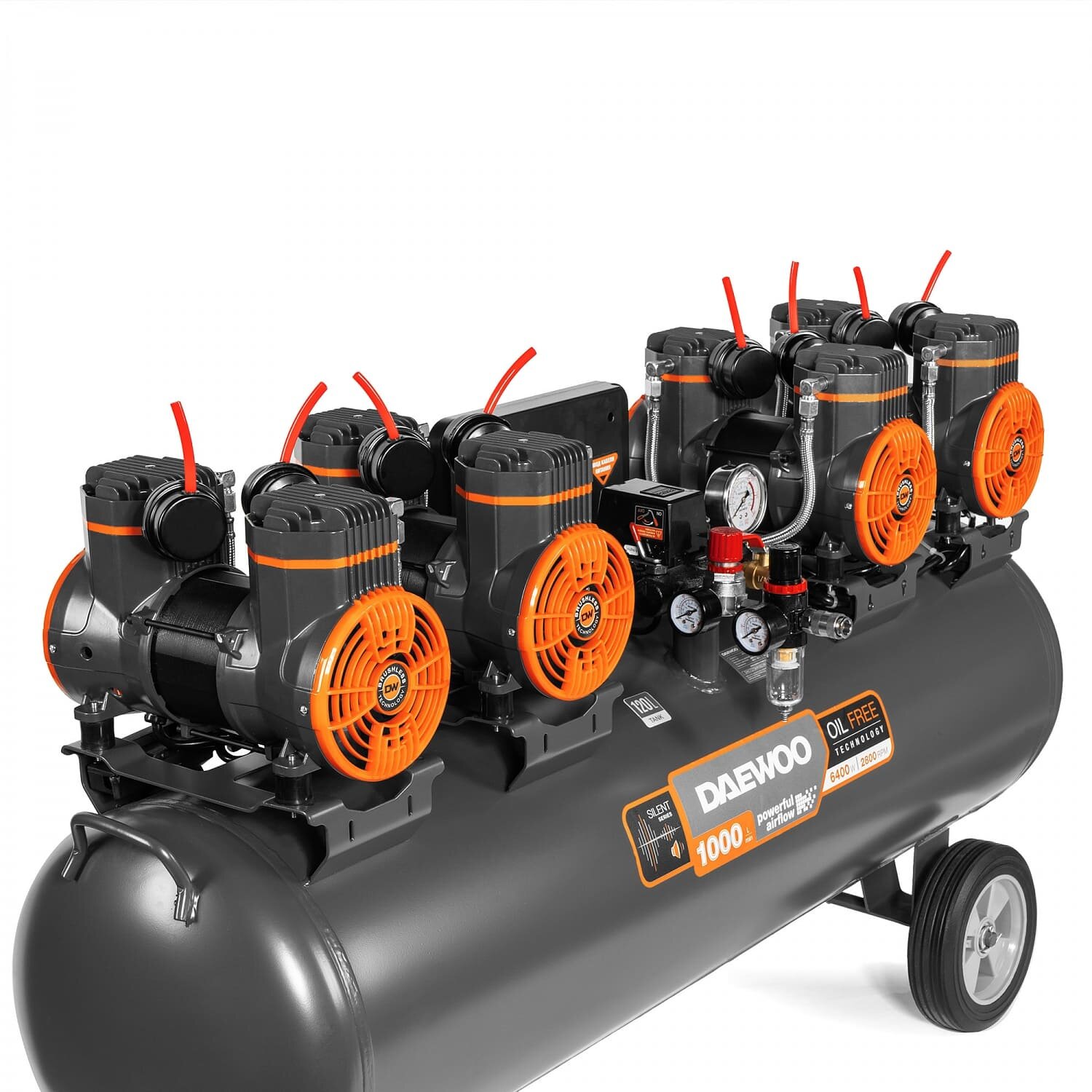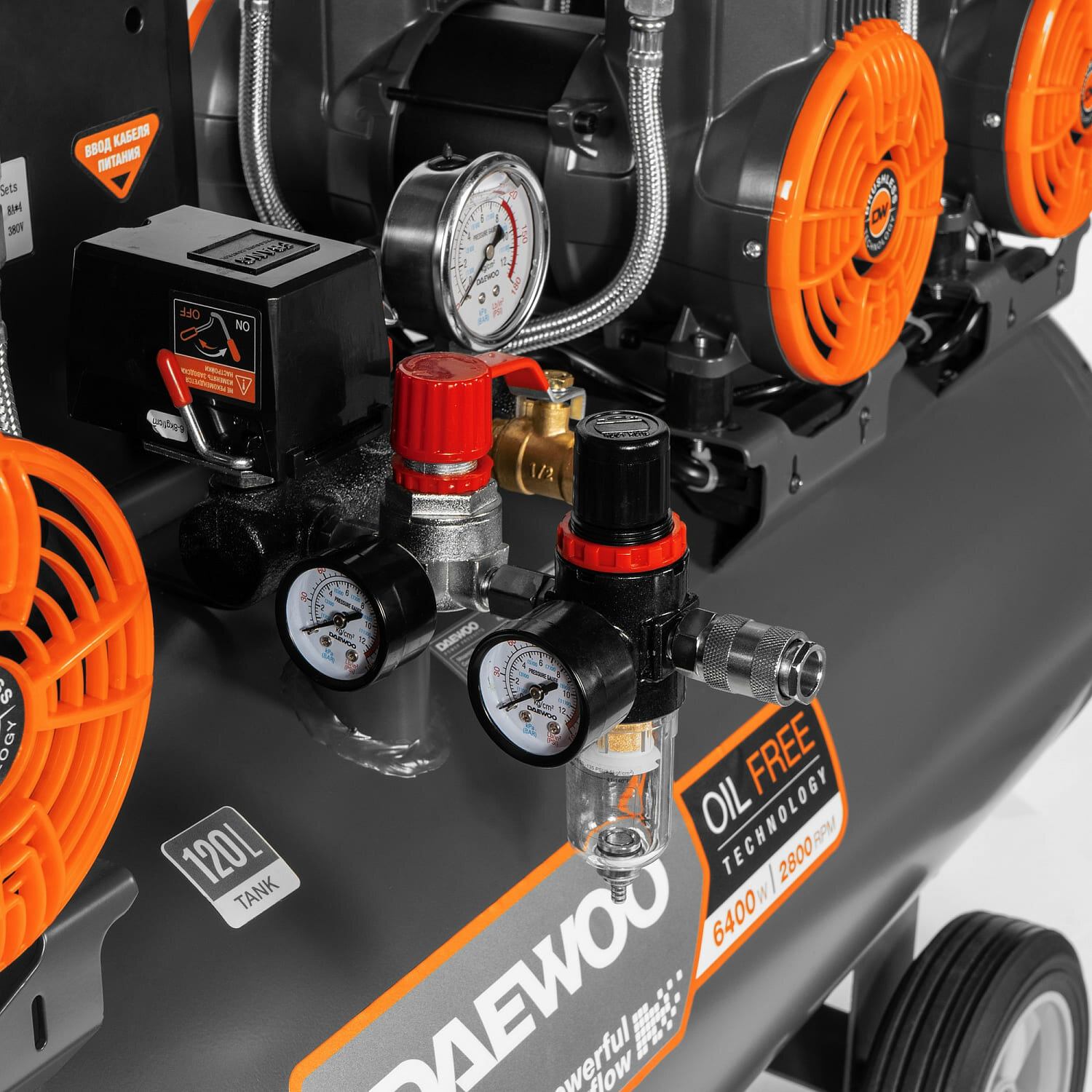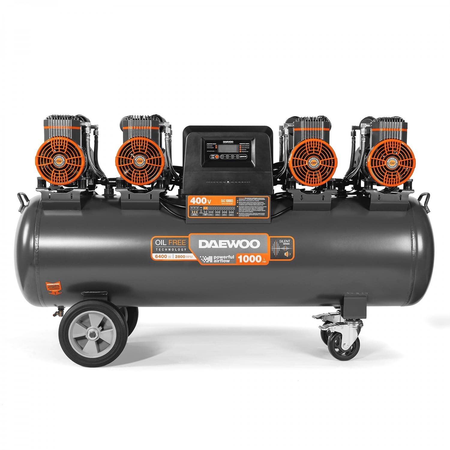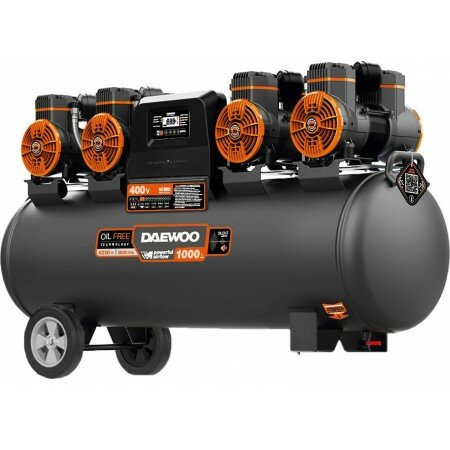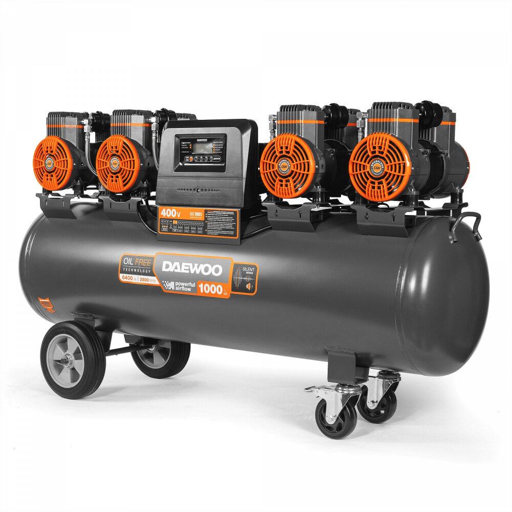 Компрессор безмасляный Daewoo DAC1000S обеспечивает высокую эффективность и стабильность подачи сжатого воздуха на пневматическое оборудование. Оснащен высокопроизводительнм и тихим электродвигателем мощностью 6400 Вт и частотой вращения 2800 об/мин. Специально разработан для воздушных компрессоров. Обладает высоким рабочим ресурсом. Работает значительно тише аналогов.Преимущества Индивидуальный воздушный фильтр каждого из цилиндров облегчают поступление воздуха для сжатия Высокая производительность до 1000 л/мин Отдельные магистрали закачки воздуха в ресивер Теплоотводящие ребра увеличенного размера, размещенные на блоке цилиндров, обеспечивают эффективное охлаждение и длительную, непрерывную работу. 2-а больших вентилятора создают усиленный воздушный поток и на 40% более эффективно охлаждают поршневую группу и двигатель 4 степени защиты на компрессоре Два манометра точной настройки выходного давления при помощи регулятора давления Быстросъёмный выход под ¼ дюйма, упрощает подключение и перекрывает подачу воздуха при отключении шланга Осушитель с манометром. Удаляет из пневмолинии излишнюю влагу и конденсат, обеспечивая дополнительную очистку подаваемого воздуха Цифровой контроллер с ЖК-дисплеем. Позволяет в реальном времени считывать информацию о режиме работы компрессора, его состоянии и параметрах, а так же осуществлять управление работой устройства Транспортировочные колеса увеличенного диаметра. Позволяют быстро и с удобством перевезти компрессор в любое место рабочего пространства