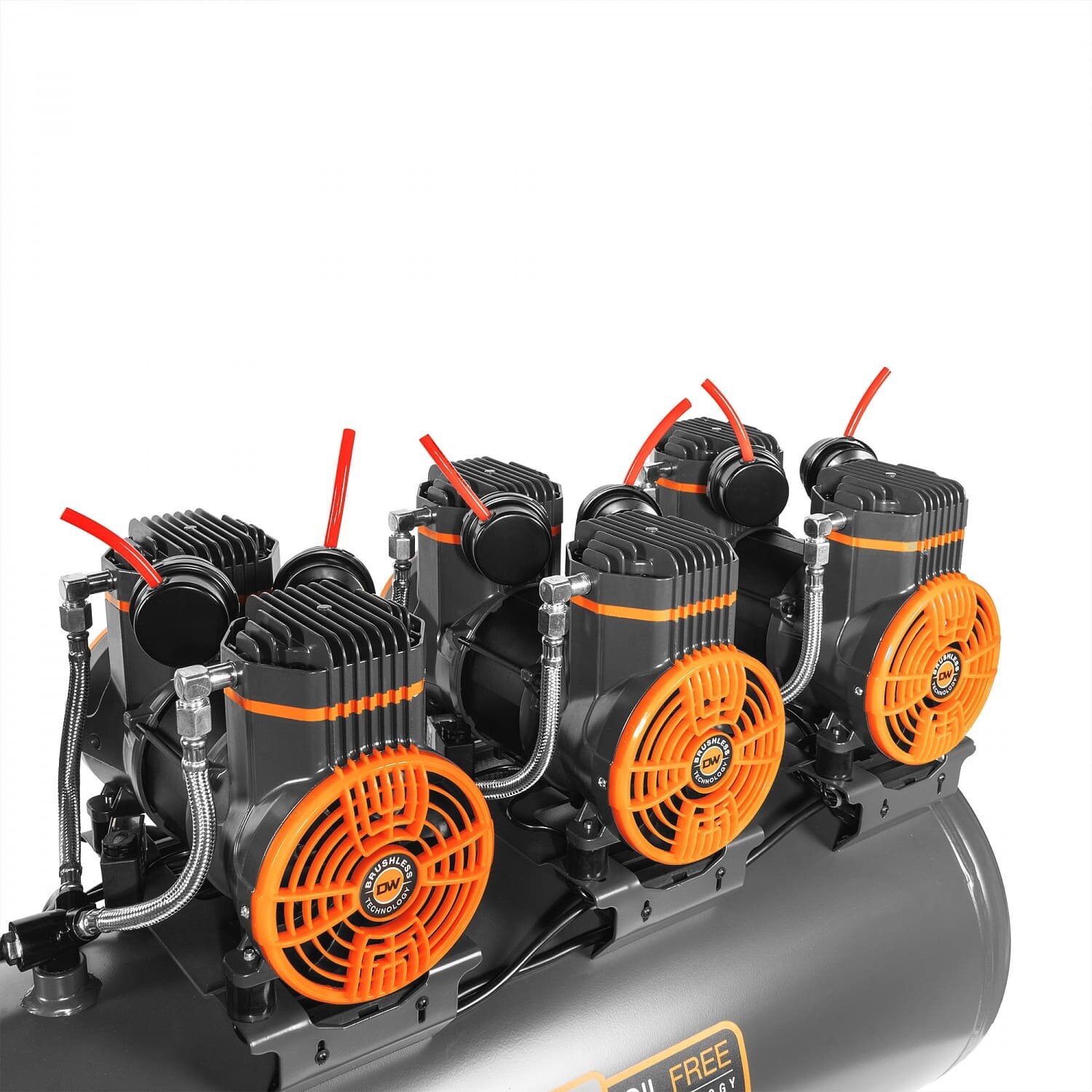 Поршневой безмасляный компрессор обеспечивает высокую эффективность и стабильность подачи сжатого воздуха на пневматическое оборудование. Оснащен высокопроизводительным и тихим электродвигателем мощностью 4800 Вт и частотой вращения 2800 об/мин. Специально разработан для воздушных компрессоров. Обладает высоким рабочим ресурсом. Работает значительно тише аналогов.Преимущества Индивидуальный воздушный фильтр каждого из цилиндров облегчают поступление воздуха для сжатия Высокая производительность до 720 л/мин Отдельные магистрали закачки воздуха в ресивер Теплоотводящие ребра увеличенного размера, размещенные на блоке цилиндров, обеспечивают эффективное охлаждение и длительную, непрерывную работу. 2-а больших вентилятора создают усиленный воздушный поток и на 40% более эффективно охлаждают поршневую группу и двигатель 4 степени защиты на компрессоре Два манометра точной настройки выходного давления при помощи регулятора давления Быстросъёмный выход под ¼ дюйма, упрощает подключение и перекрывает подачу воздуха при отключении шланга Осушитель с манометром удаляет из пневмолинии излишнюю влагу и конденсат, обеспечивая дополнительную очистку подаваемого воздуха Цифровой контроллер с ЖК-дисплеем позволяет в реальном времени считывать информацию о режиме работы компрессора, его состоянии и параметрах, а так же осуществлять управление работой устройства Транспортировочные колеса увеличенного диаметра позволяют быстро и с удобством перевезти компрессор в любое место рабочего пространства