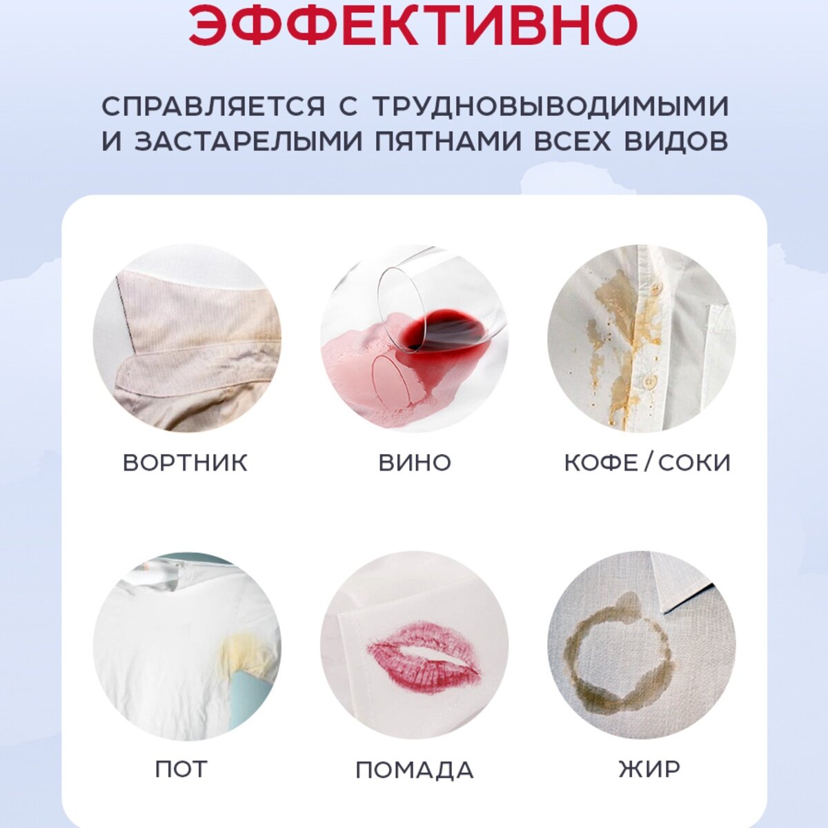 Ткань лучше вначале проверить на устойчивость цвета, иначе оставит обесцвеченое пятно, так случилось с футболкой тёмного цвета. Наносится как гель, только лучше предварительно намочить пятно и держать не дольше 15 минут, и сразу же застирать, а уж после этого отправлять в стирку. С белых тканей выводит пятна легко без следов, а вот цветные и тёмные вещи можно испортить.