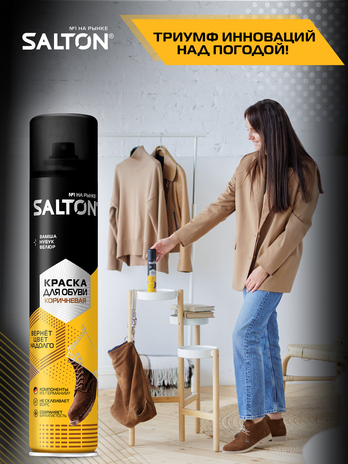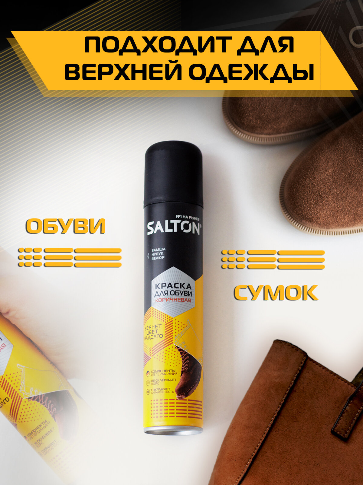 Краска для обуви Salton. Коричневая замшевая обувь - это классика. Многие задаются вопросом, возможно ли при ежедневной носке надолго сохранить глубокий цвет любимой замшевой обуви. Конечно, возможно, если регулярно использовать краску для замшевой обуви Salton. Это универсальное средство подходит не только для обуви, но также для одежды и аксессуаров. Благодаря специальным металлокомплексным красителям в составе, а также особой технологии распыления краска для замши, нубука и велюра Salton обеспечивает узконаправленное окрашивание в насыщенный коричневый оттенок. Краска Salton быстро и эффективно восстанавливает цвет обрабатываемого изделия, сохраняя бархатистость замши и не склеивая ворс. Краска для обуви Salton с цветом коричневый подойдет для синей замши, нубука, велюра и мембранных материалов. Спрей-краска для замши Salton легко возвращает Вашей обуви и одежде первоначальный цвет и помогает надолго сохранить ее яркой и красивой.