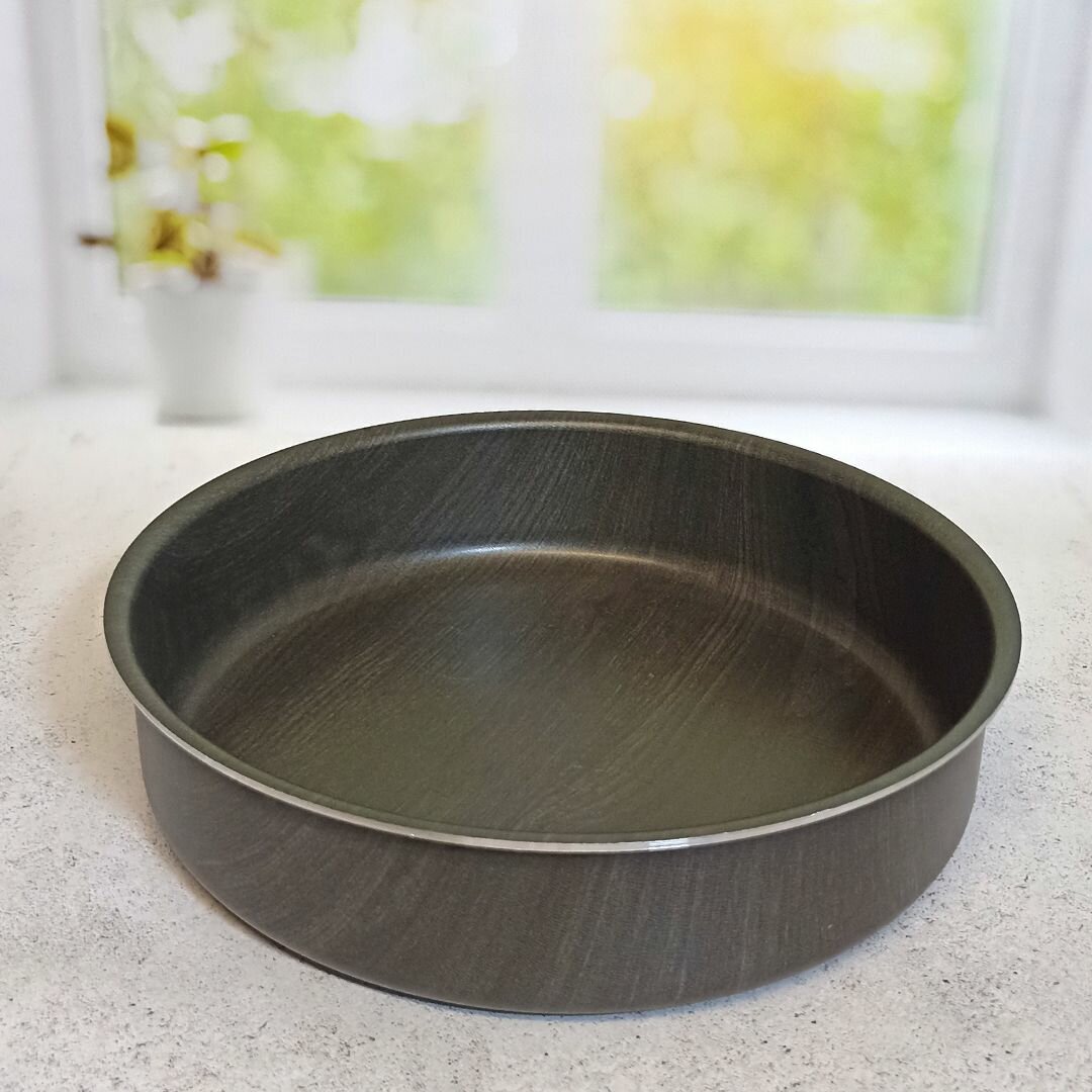 Противень круглый, алюминиевый имеет экологически безопасное покрытие на водной основе, без PFOA. Толщина стенок и дна 2,2 мм. Высота стенки по внутренней стороне 6,8 см. Можно мыть в ПММ.