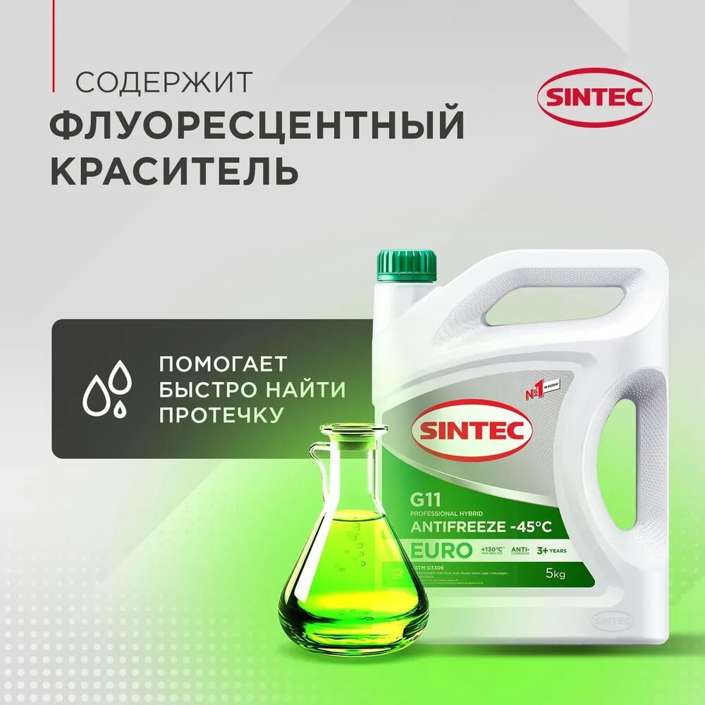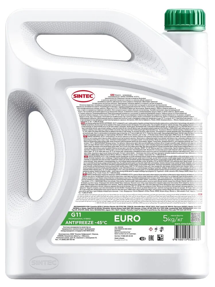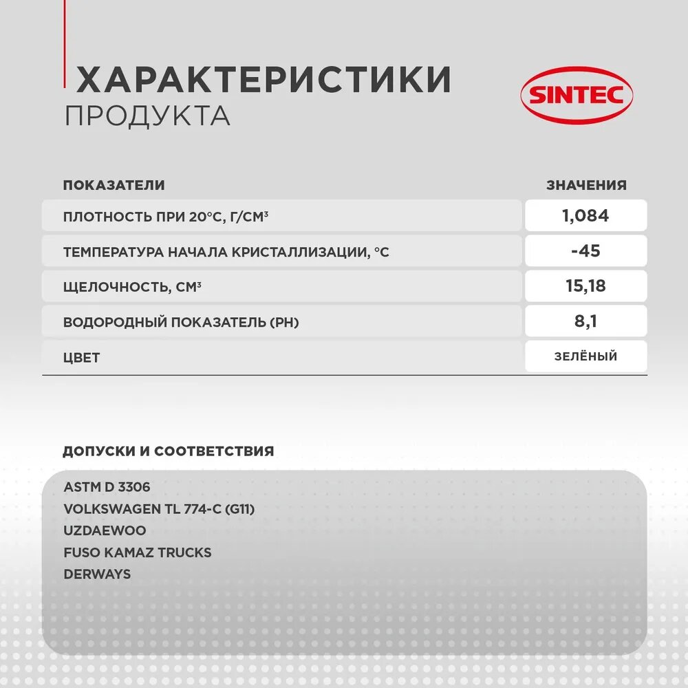 Sintec Antifreeze Euro G11 green -40 - готовая к применению высококачественная низкозамерзающая охлаждающая жидкость. Изготовлена из высококачественного моноэтиленгликоля и пакета присадок на основе гибридной технологии, специально адаптированной для российских условий эксплуатации. Обеспечивает правильный тепловой режим эксплуатации двигателя, предотвращает появление коррозии и отложений в системе охлаждения. Разработана для применения в бензиновых и дизельных двигателях легкового и коммерческого транспорта отечественного и зарубежного производства, и других транспортных средств со средними и тяжелыми условиями эксплуатации, где к применению рекомендованы охлаждающие жидкости соответствующего эксплуатационного уровня. Отлично защищает цветные металлы. Не допускает замерзания, перегрева и появления воздушных пробок. Обладает эффективными смазывающими свойствами, продлевающими ресурс насоса. Не повреждает шланги, прокладки и уплотнения системы охлаждения.