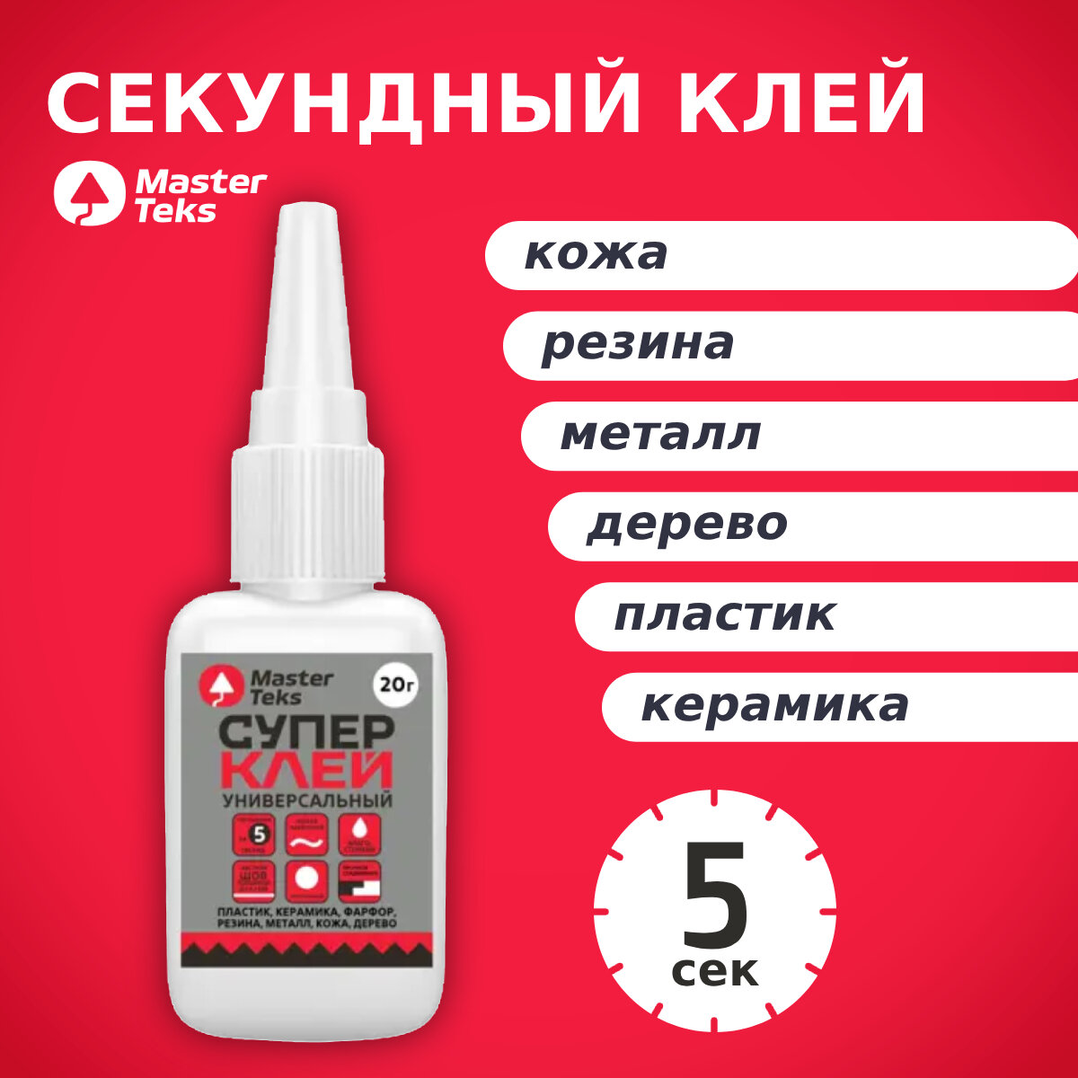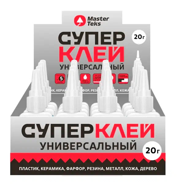 **Супер-клей Masterteks** — универсальный однокомпонентный цианакрилатный клей предназначен для моментального и надежного склеивания изделий из разнообразных материалов, включая пластик, керамику, фарфор, резину, металл, кожу, дерево и другие. Его прозрачные свойства обеспечивают невидимое соединение поверхностей, сохраняя эстетику изделий. Клей имеет особую консистенцию, что позволяет корректировать положение склеиваемых деталей перед окончательным фиксированием. Обладает моментальным действием, обеспечивая быстрое и эффективное склеивание. Особая консистенция клея позволяет корректировать положение склеиваемых деталей перед окончательным фиксированием.