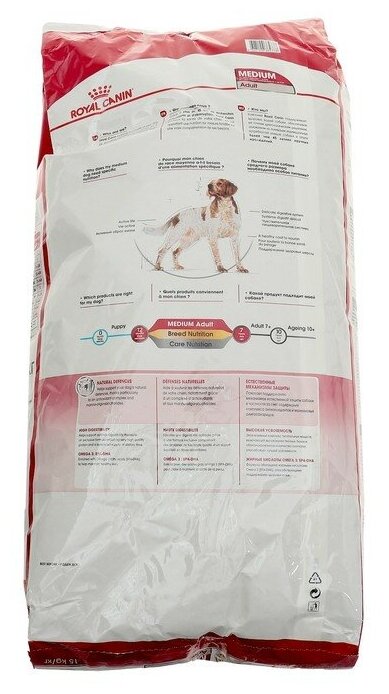Корм для собак средних размеров. Полнорационный корм для взрослых собак средних размеров (весом от 11 до 25 кг) в возрасте от 12 месяцев до 7 лет.