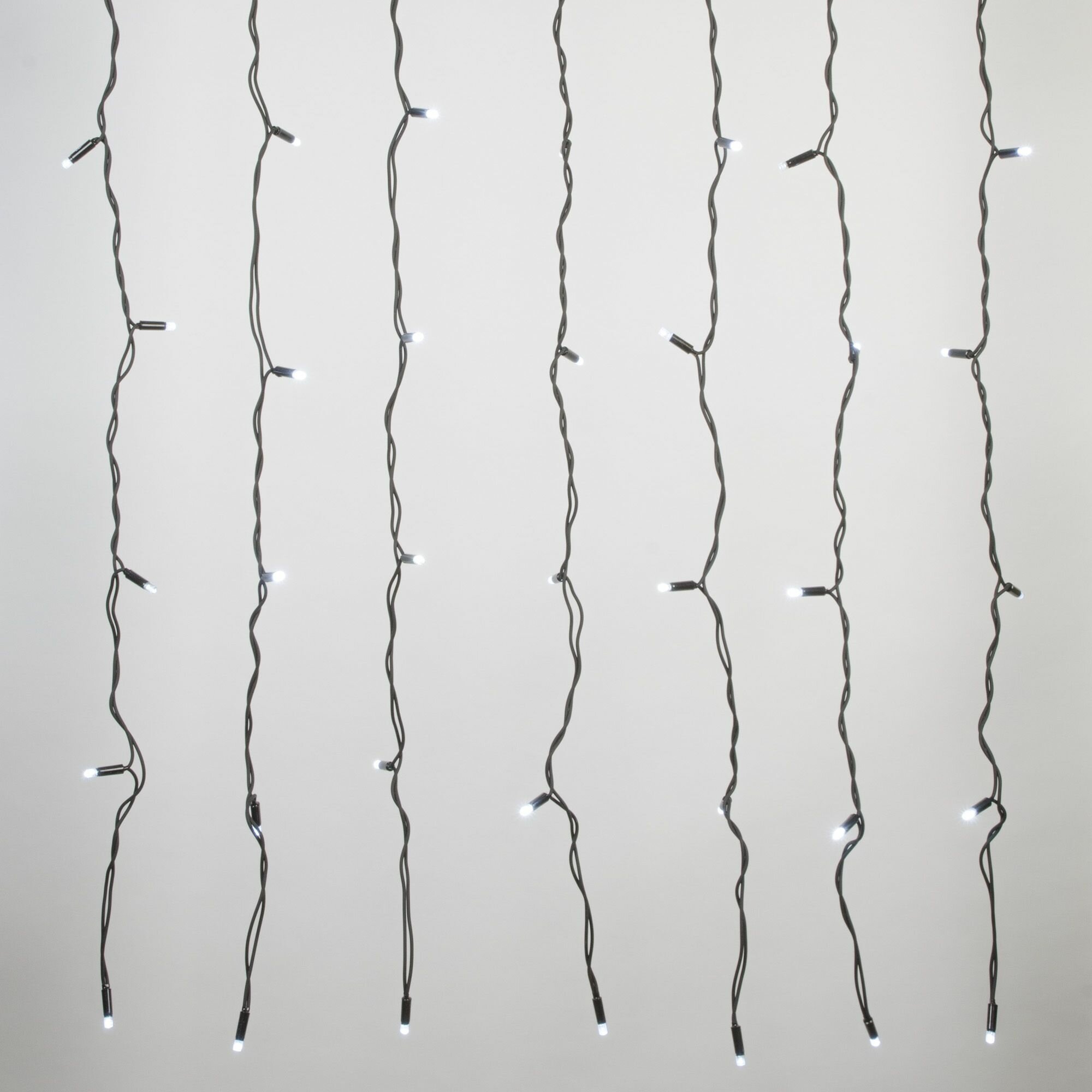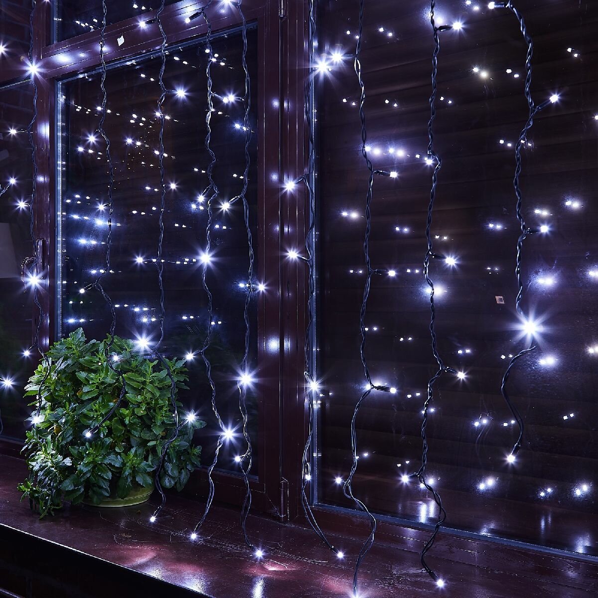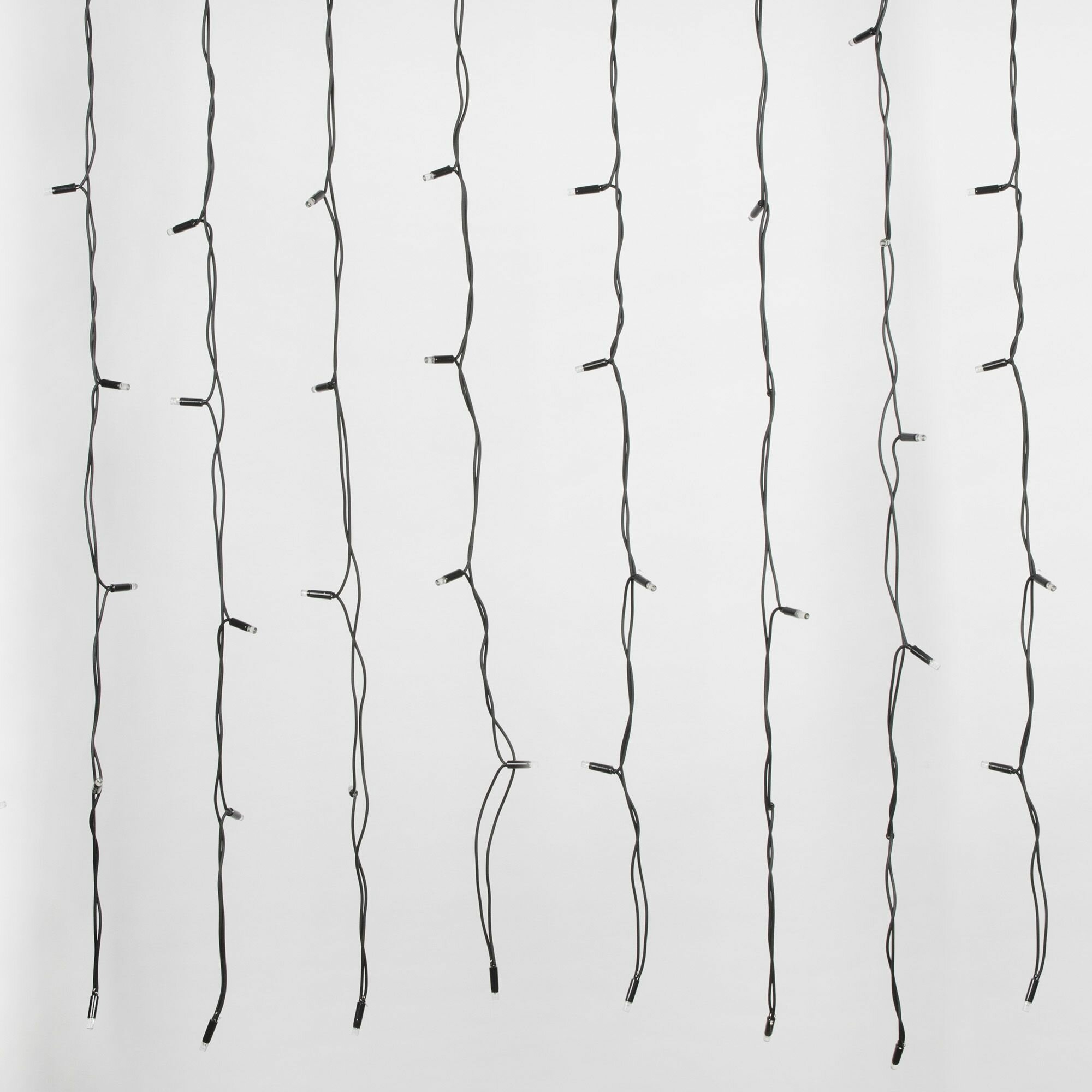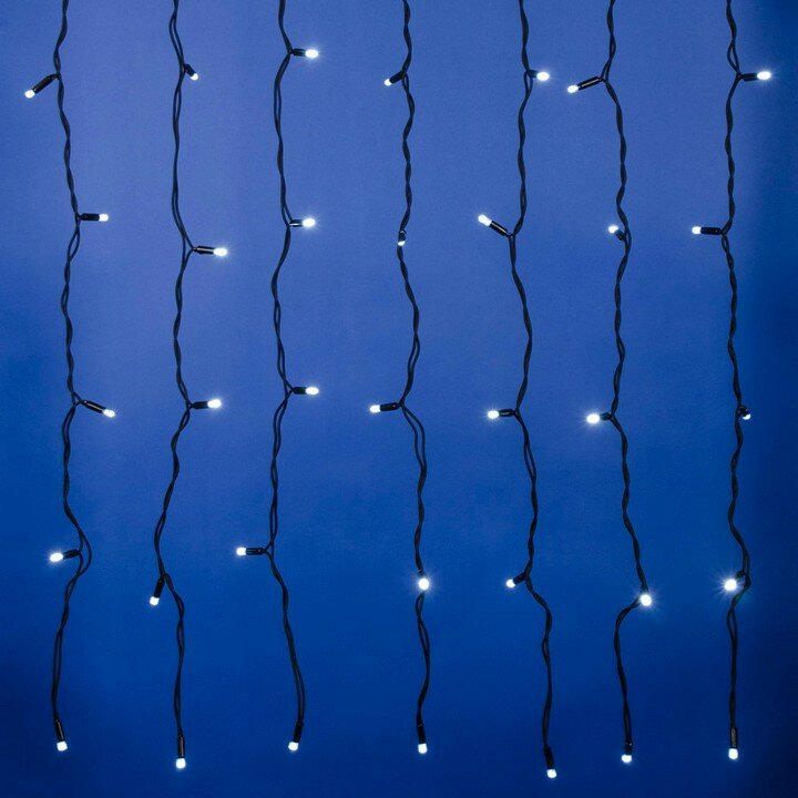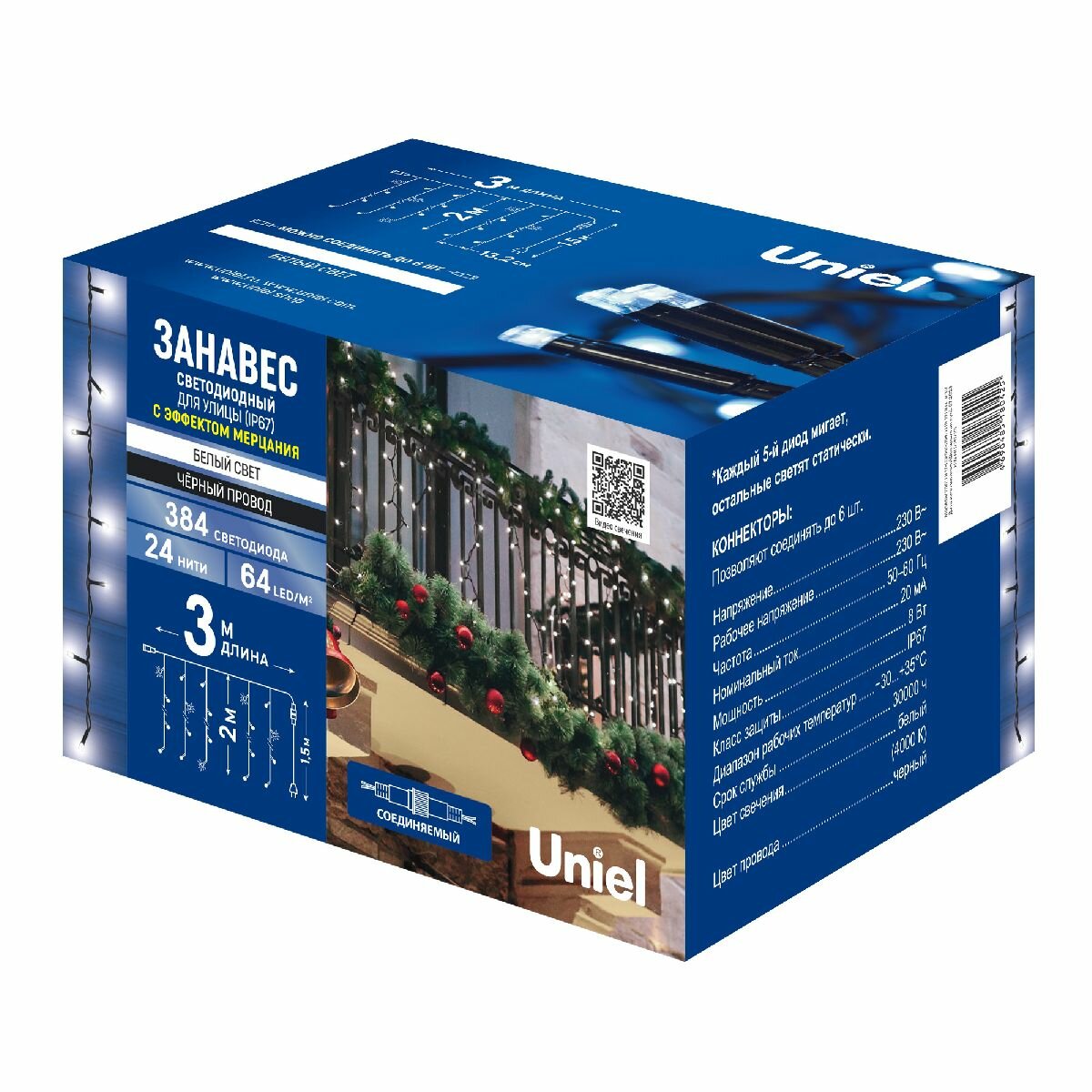 "**Гирлянда светодиодная Uniel «Занавес»** предназначена для оформления окна. Также гирлянду можно растянуть по стене или по мебельному фасаду, закрепить на потолке, визуально разделив помещение. Эффективно освещает площадь до 6 м². На световой части гирлянды длиной 3 м располагаются 24 нити, включающие всего 384 светодиодов.