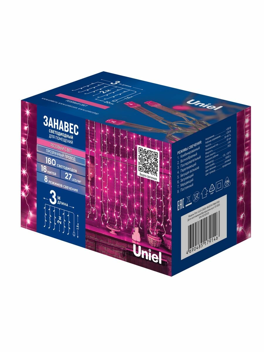 Гирлянда светодиодная занавес Uniel электрическая 3x2 м розовый свет 8 режимов 160 ламп цвет прозрачный