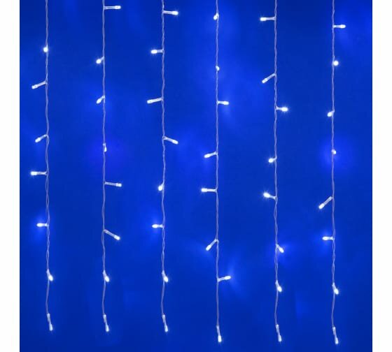 "**Гирлянда светодиодная Uniel «Занавес»** предназначена для оформления окна. Также гирлянду можно растянуть по стене или по мебельному фасаду, закрепить на потолке, визуально разделив помещение. Эффективно освещает площадь до 2,25 м². На световой части гирлянды длиной 1.5 м располагаются 10 нитей, включающие всего 100 светодиодов.