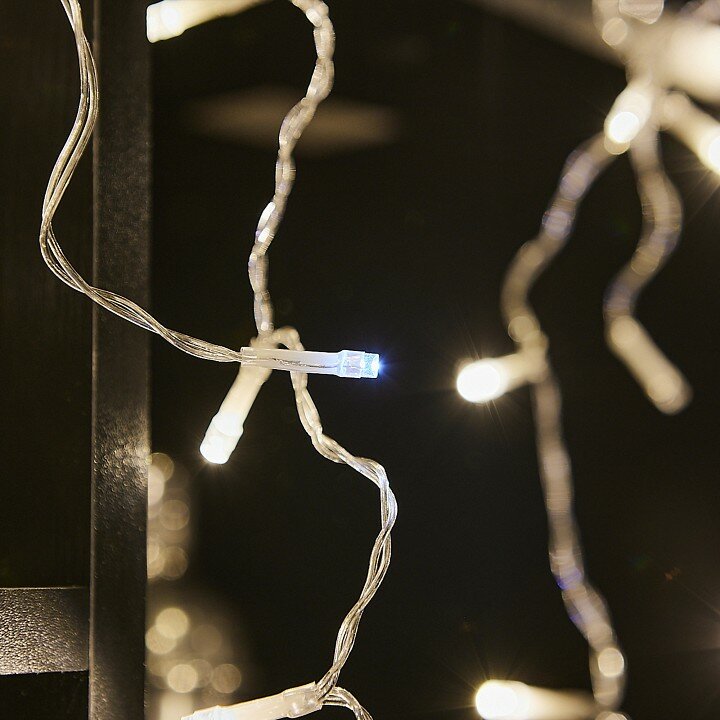 "**Электрогирлянда Uniel «Бахрома»** поможет создать яркий новогодний дизайн и праздничную атмосферу. Как правило, такую гирлянду вешают на окно: огоньки красиво отражаются в стеклах и озаряют мерцанием улицу и дом. Также ее можно повесить на дверной проём, закрепить на фасаде мебели. На световой части гирлянды длиной 25 м располагаются 88 нитей, включающие всего 725 светодиодов.