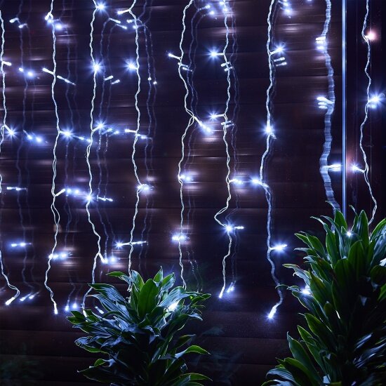 "**Гирлянда светодиодная Uniel «Занавес»** предназначена для оформления окна. Также гирлянду можно растянуть по стене или по мебельному фасаду, закрепить на потолке, визуально разделив помещение. Эффективно освещает площадь до 2,25 м². На световой части гирлянды длиной 1.5 м располагаются 10 нитей, включающие всего 100 светодиодов.