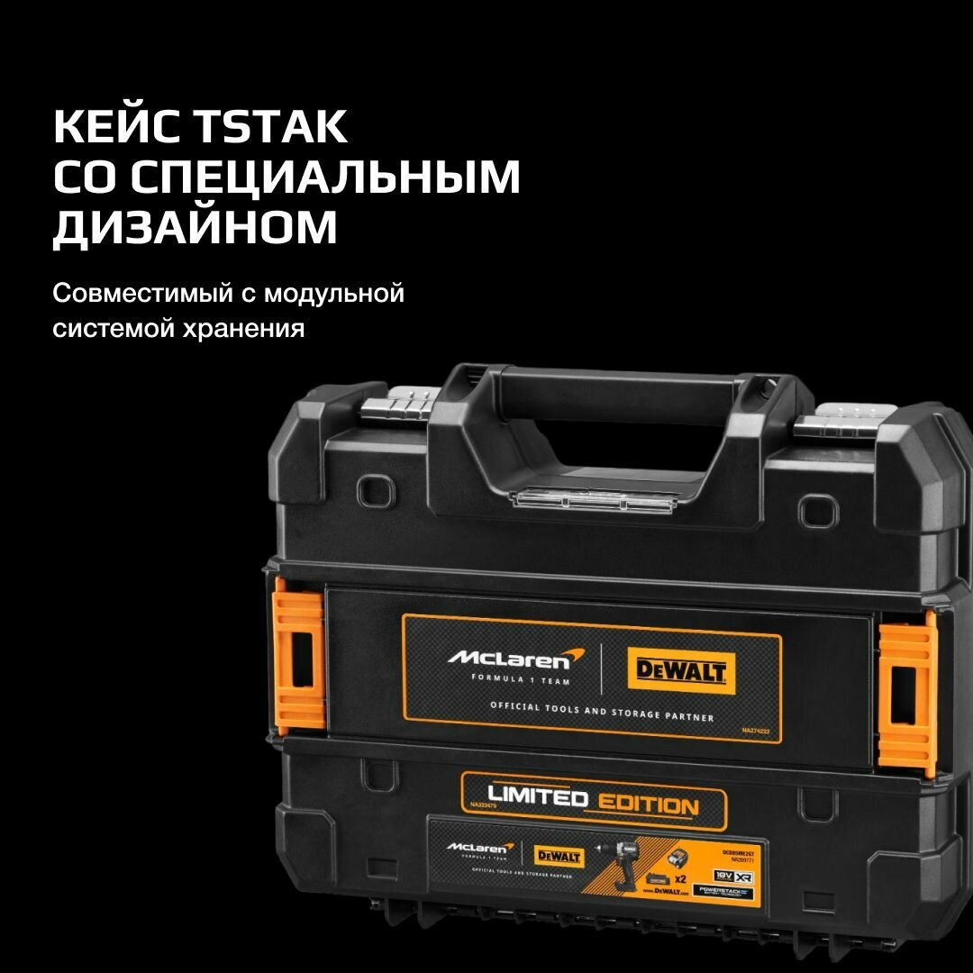 Бренд DeWALT появился на болиде Formula 1. В знак дружеских отношений компания DeWALT недавно выпустила лимитированную коллекцию инструментов, McLaren Limited Edition, куда входит и шуруповёрт DCD85ME (на базе DCD805). Инструмент оформлен в стилистике McLaren под карбон, выглядит эффектно. В комплект входят два аккумулятора DCBP034ME PowerStack McLaren Edition 18V 1.7Ah и Compact зарядное устройство, поставляется в кейсе TSTAK черного цвета. Аккумуляторная дрель-шуруповерт пригодится при отделочных, ремонтных и строительных работах для сверления отверстий и заворачивания крепежа. Питается от литий-ионного аккумулятора.