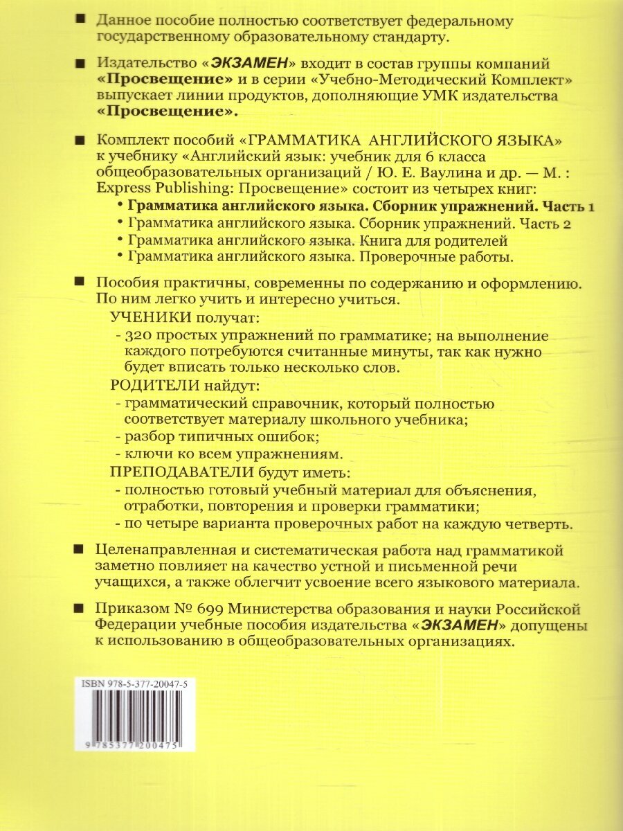 Данное пособие полностью соответствует федеральному государственному образовательному стандарту. Оно представляет собой первую часть учебного комплекта, состоящего из четырёх книг: -Грамматика английского языка. Сборник упражнений. Часть 1 -Грамматика английского языка. Сборник упражнений. Часть 2 -Грамматика английского языка. Книга для родителей -Грамматика английского языка. Проверочные работы. Пособие содержит 320 грамматических упражнений, обеспечивающих усвоение и закрепление правил грамматики, которые изучаются в 6 классе. Характер упражнений позволяет выполнять их максимально быстро, что экономит силы и время учащихся и помогает в короткие сроки добиться хорошего знания грамматики. Для учащихся 6 класса, изучающих английский язык по учебнику Ю. Е. Ваулиной и др. "Spotlight. Английский язык. 6 класс".