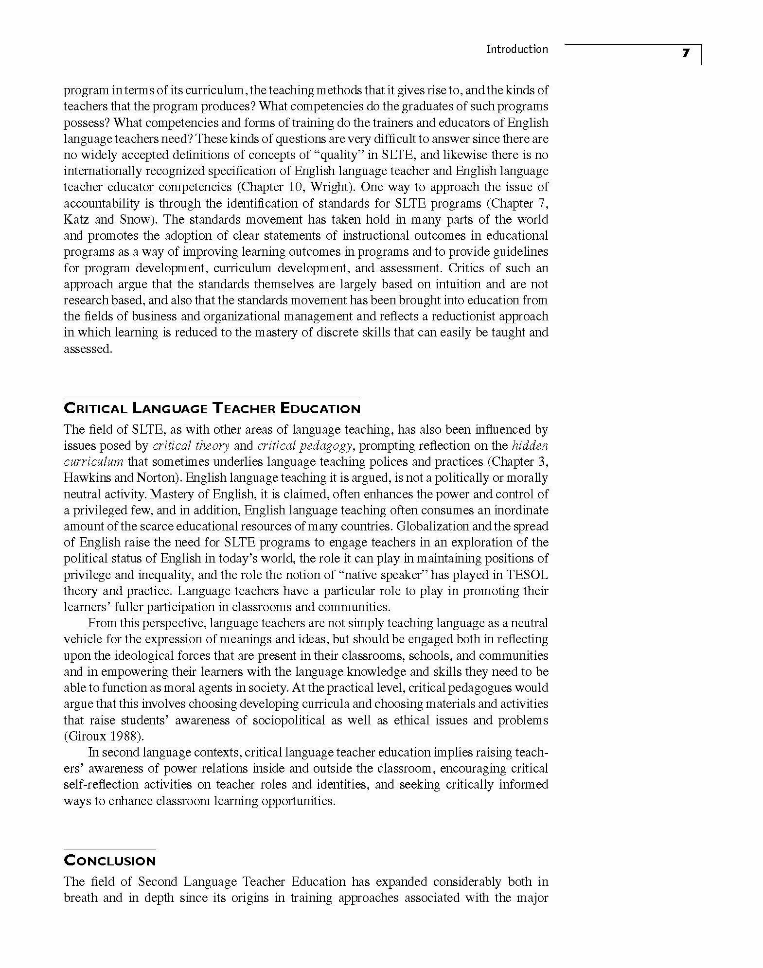 This collection provides an overview of current issues, debates, and approaches in Second Language Teacher Education (SLTE) presented by internationally prominent researchers, educators, and emerging scholars. Chapters address such issues as distance education, non-native English-speaking educators, technology, assessment, standards, and the changing contexts of contemporary language teaching and teacher education.