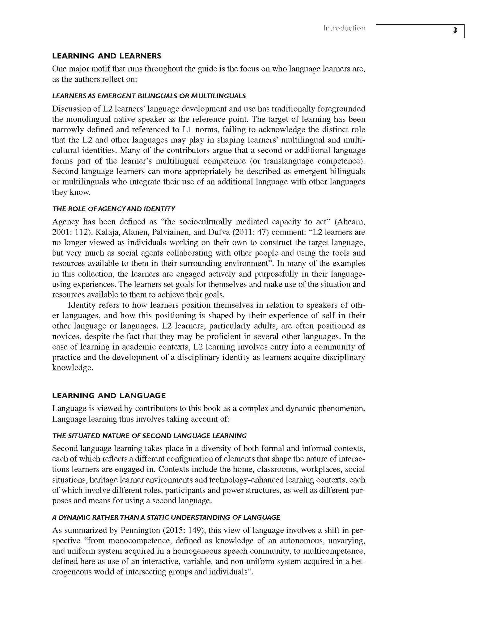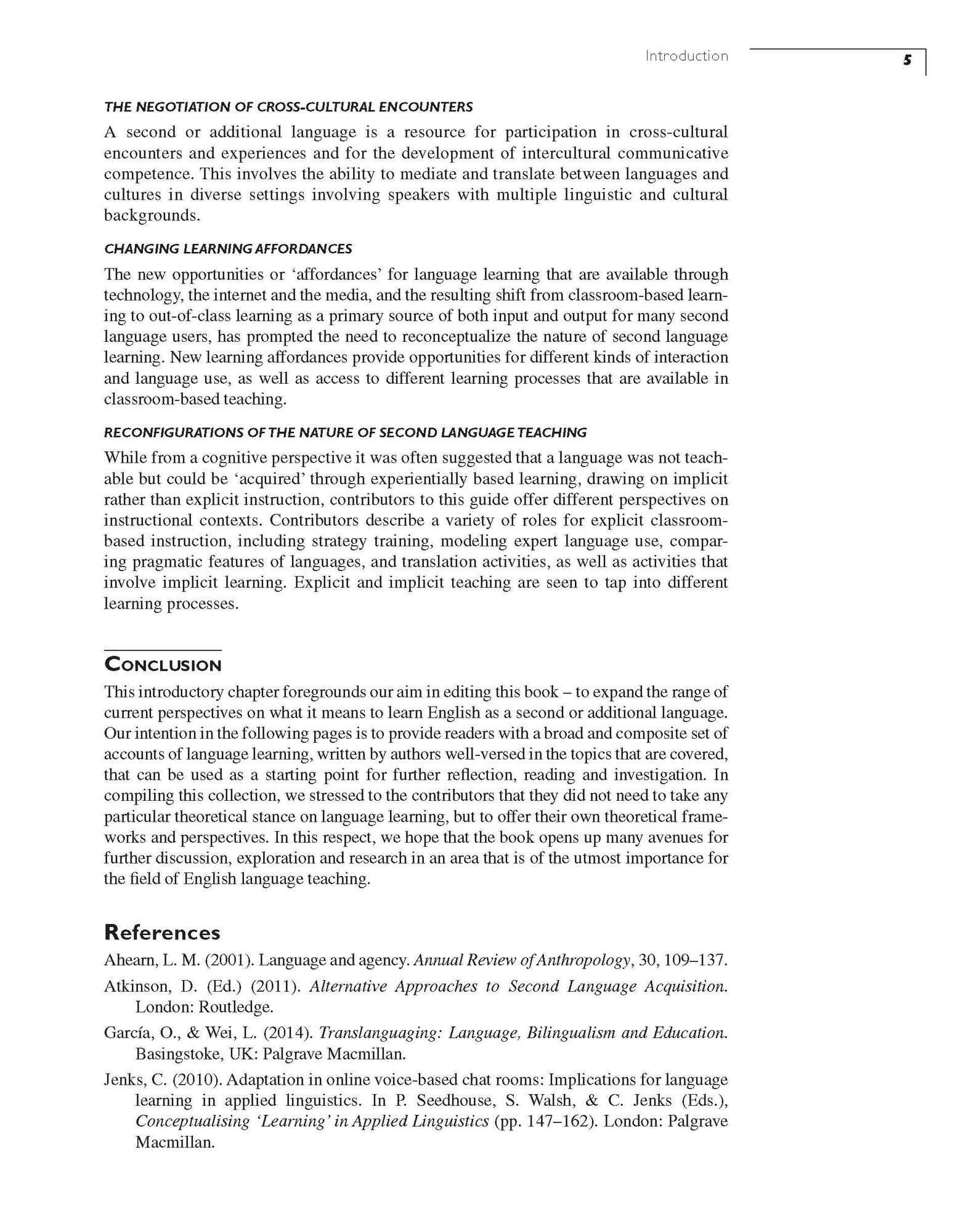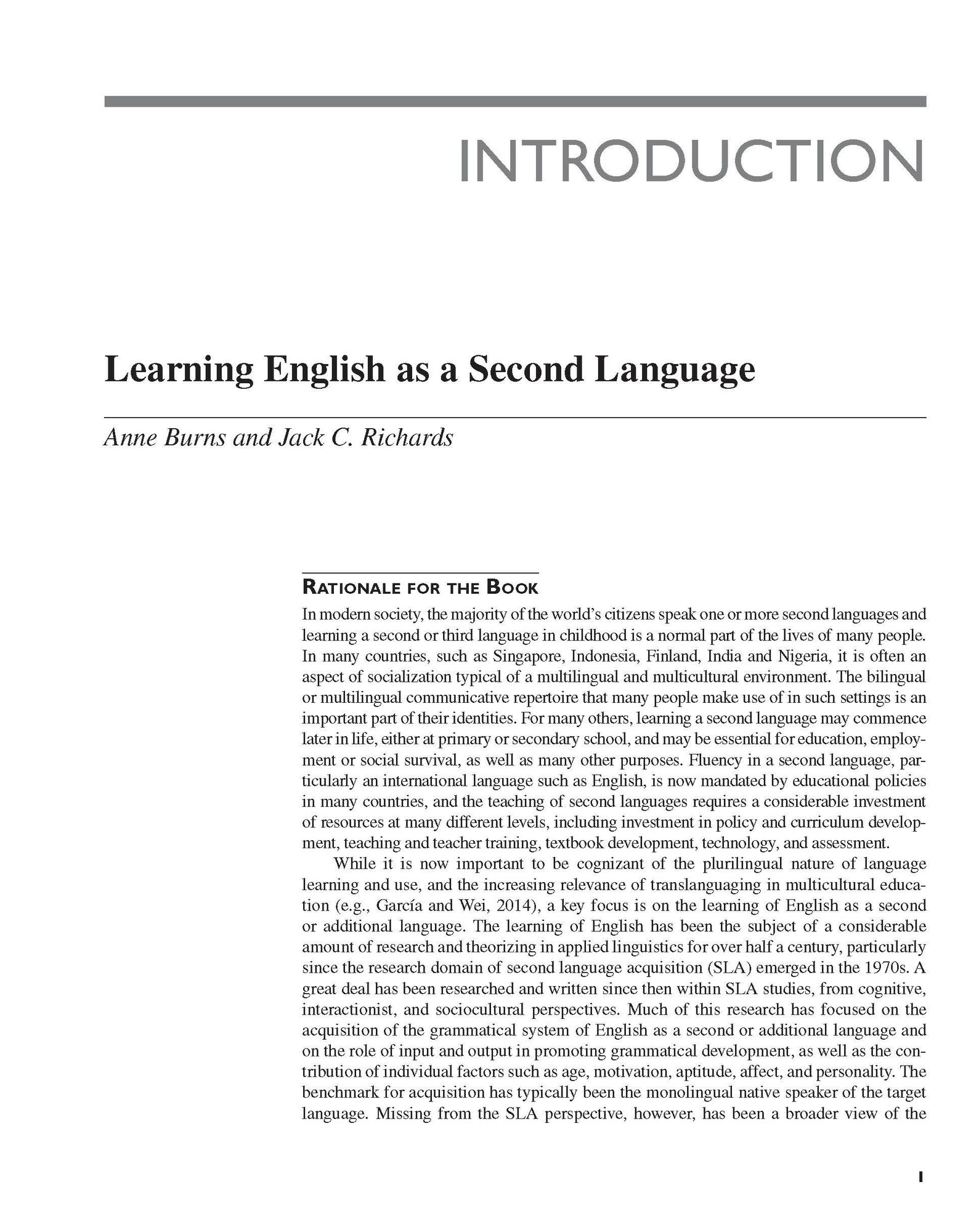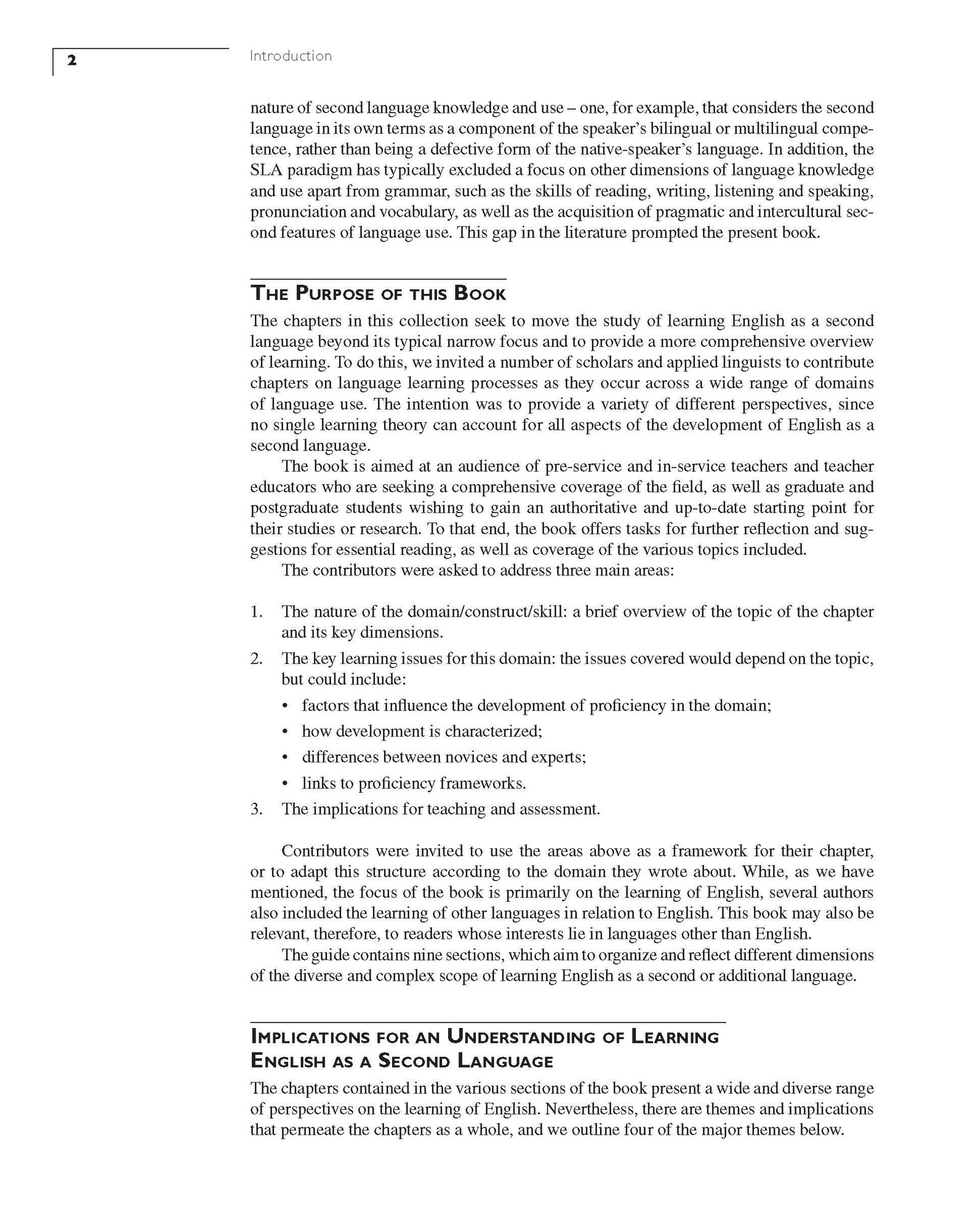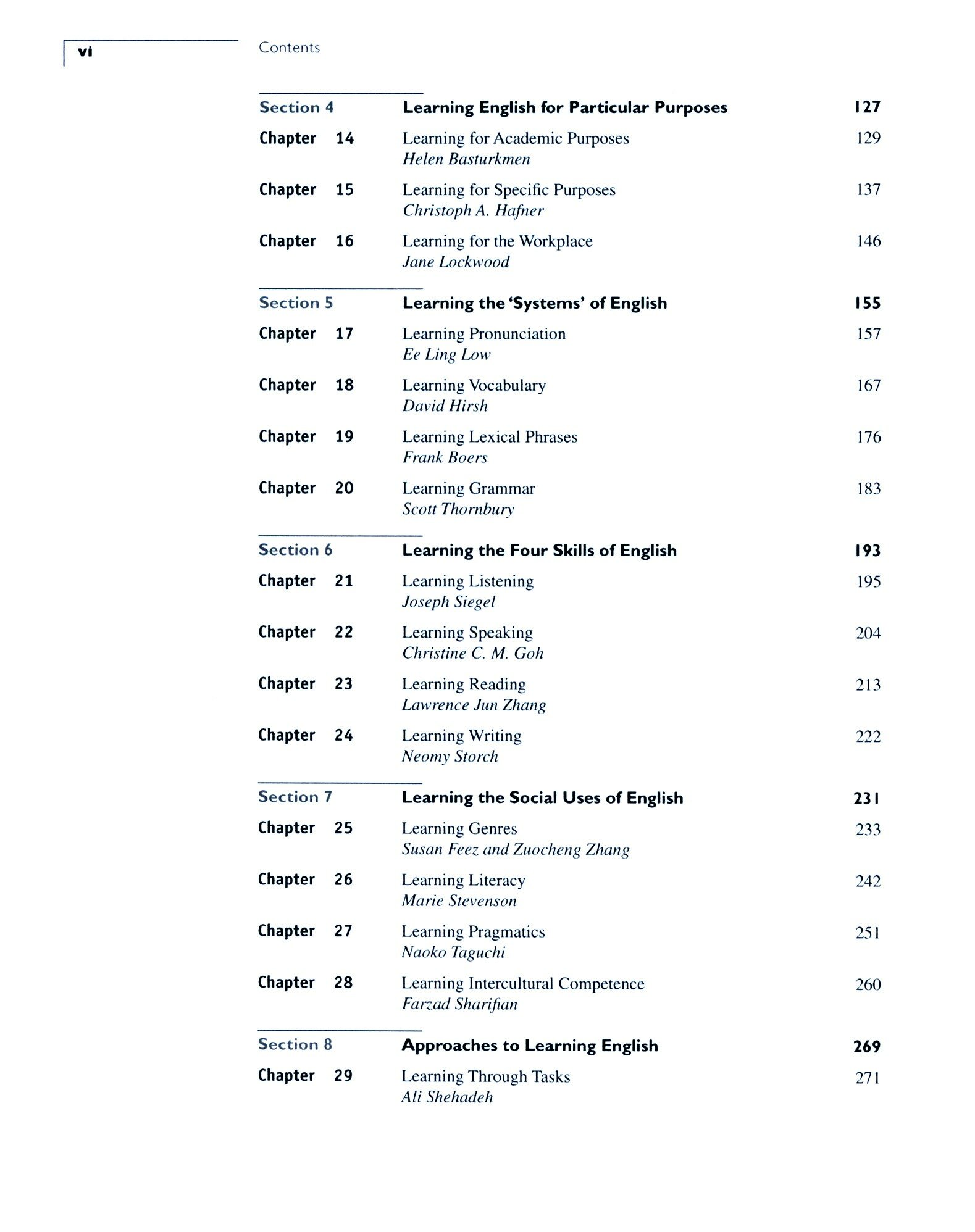 This volume provides an up-to-date and comprehensive coverage of second language learning. The focus throughout the book is primarily on language learning, but each chapter also discusses the implications for teaching and assessment, thus informing both understanding and practice. The book contains nine sections, which aim to organise and reflect different dimensions of the diverse and complex scope of learning English as a second or additional language. Four themes which permeate the chapters are: learning and learners; learning and language; learning and language development; learning and learning context. The 36 chapters are up-to-date and authoritative, written by experts in the field. The content is accessibly written, with questions for discussion and follow-up reading suggestions provided.