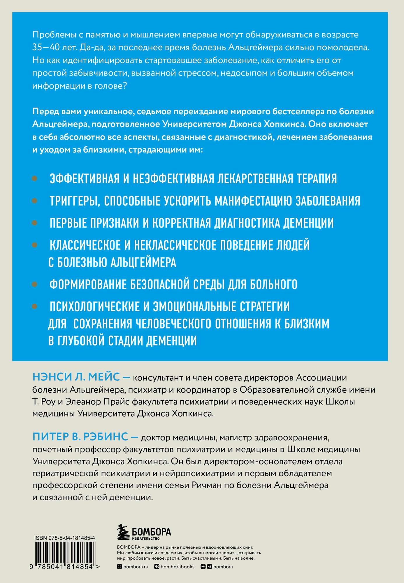 Проблемы с памятью и мышлением впервые могут обнаруживаться в возрасте 35—40 лет. Да-да, за последнее время болезнь Альцгеймера сильно помолодела. Но как идентифицировать стартовавшее заболевание, как отличить его от простой забывчивости, вызванной стрессом, недосыпом и большим объемом информации в голове? Перед вами уникальное, седьмое переиздание мирового бестселлера по болезни Альцгеймера, подготовленное Институтом Хопкинса. Оно включает в себя абсолютно все аспекты, связанные с диагностикой, лечением заболевания и уходом за близкими, страдающими им.