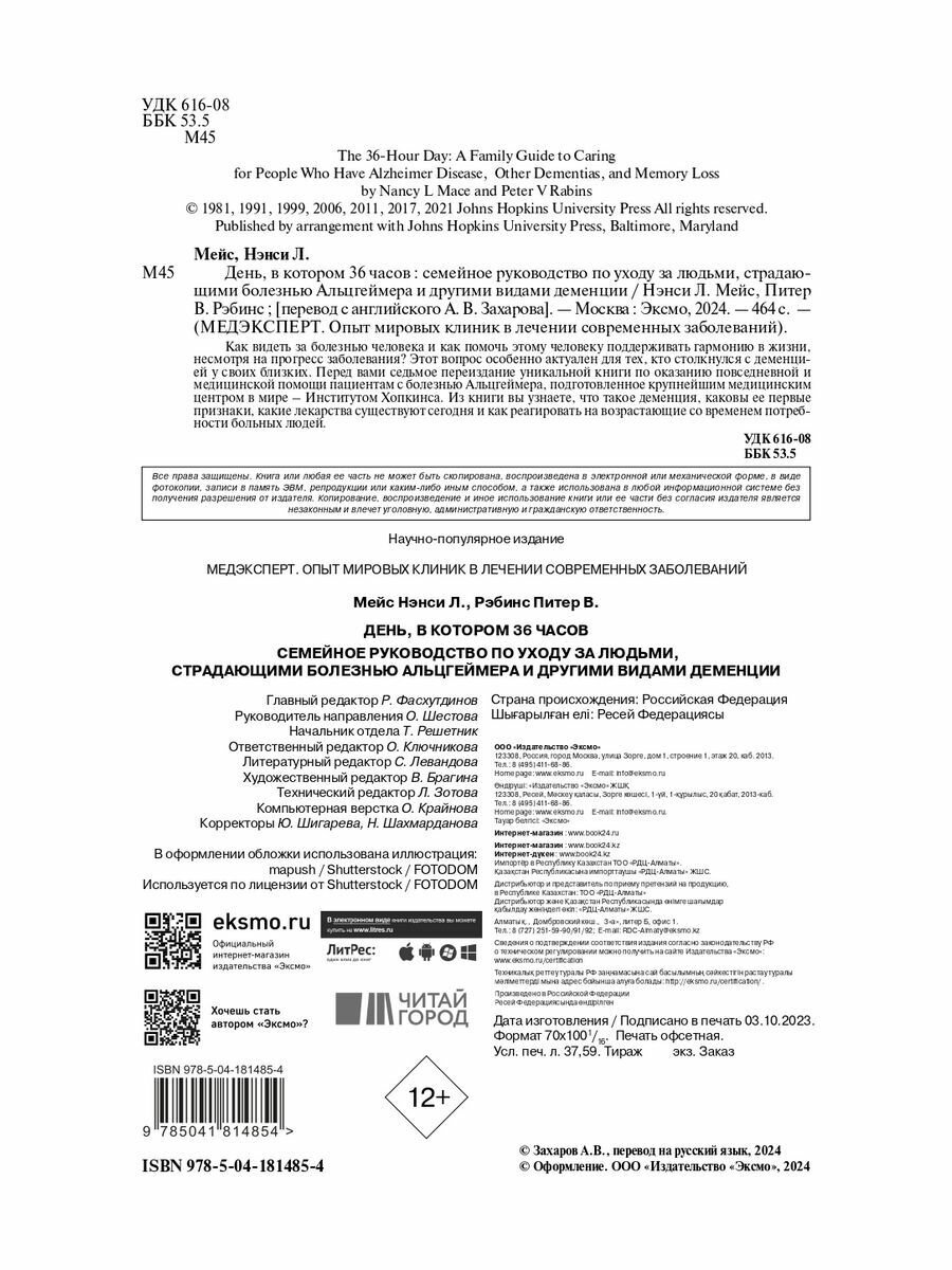 День в котором 36 часов. Семейное руководство по уходу за людьми страдающими болезнью Альцгеймера и другими видами деменции (Мейс Нэнси Л., Рэбинс Питер В.); ООО "Издательство "Эксмо", 2023