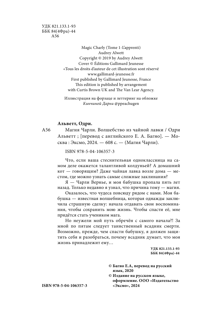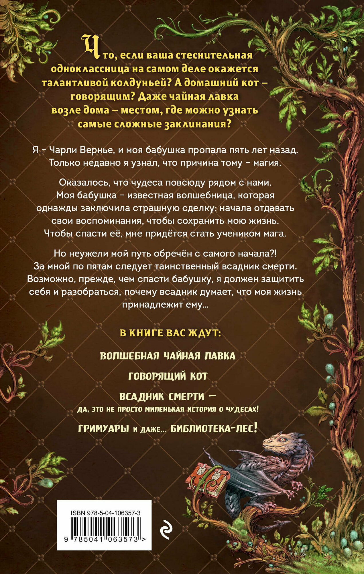 Что, если ваша стеснительная одноклассница на самом деле окажется талантливой колдуньей? А домашний кот – говорящим? Даже чайная лавка возле дома – местом, где можно узнать самые сложные заклинания? Я – Чарли Вернье, и моя бабушка пропала пять лет назад. Только недавно я узнал, что причина тому – магия. Оказалось, что чудеса повсюду рядом с нами. Моя бабушка – известная волшебница, которая однажды заключила страшную сделку – начала отдавать свои воспоминания, чтобы сохранить мою жизнь. Чтобы спасти её, мне придётся стать учеником мага. Но неужели мой путь обречён с самого начала?! За мной по пятам следует таинственный всадник смерти. Возможно, прежде чем спасти бабушку, я должен защитить себя и разобраться, почему всадник думает, что моя жизнь принадлежит ему… В книге вас ждут: волшебная чайная лавка говорящий кот всадник смерти – да, это не просто миленькая история о чудесах! гримуары и даже… библиотека-лес!