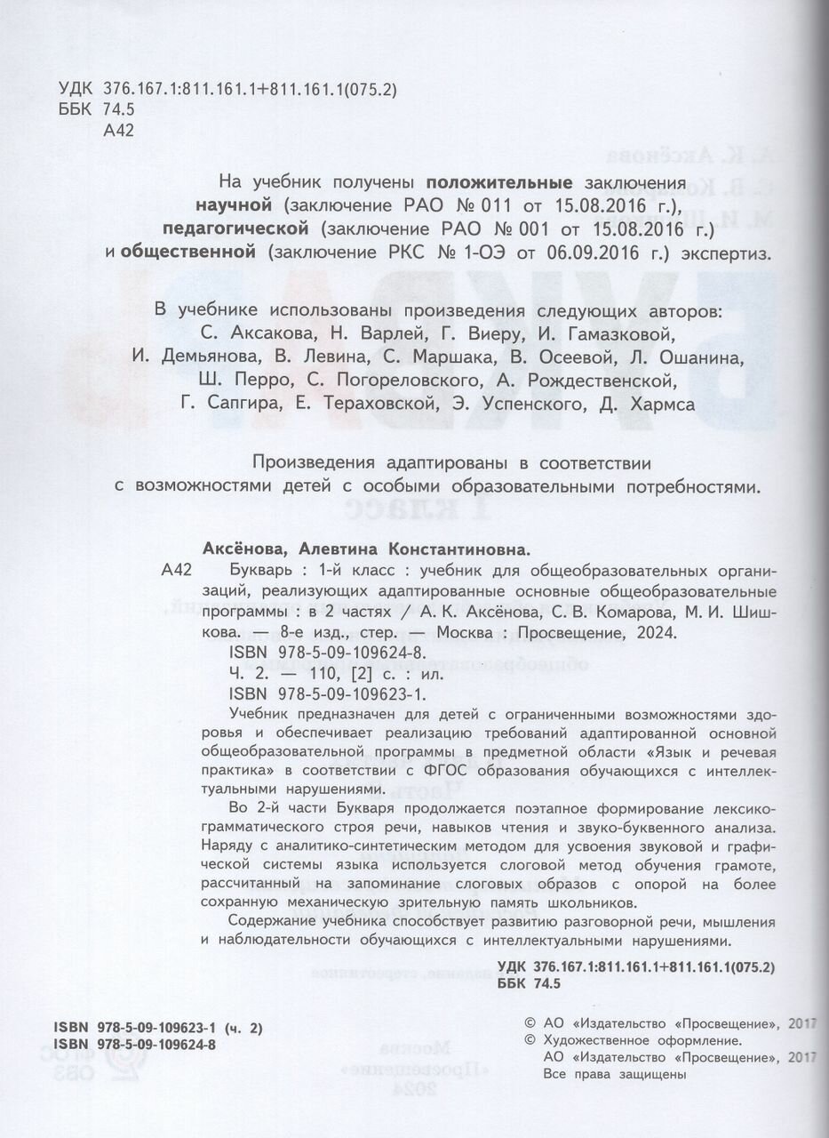 Букварь. 1 класс. Учебник. В двух частях. Часть 2 (для обучающихся с интеллектуальными нарушениями) (Шишкова Маргарита Игоревна,Аксёнова Алевтина Константиновна,Комарова Софья Вадимовна); Просвещение, 2024