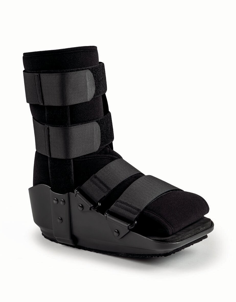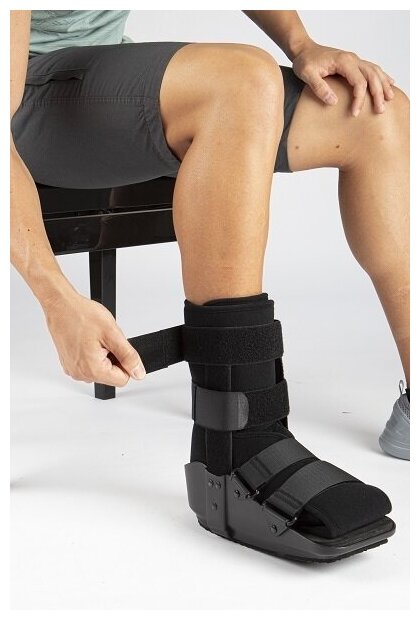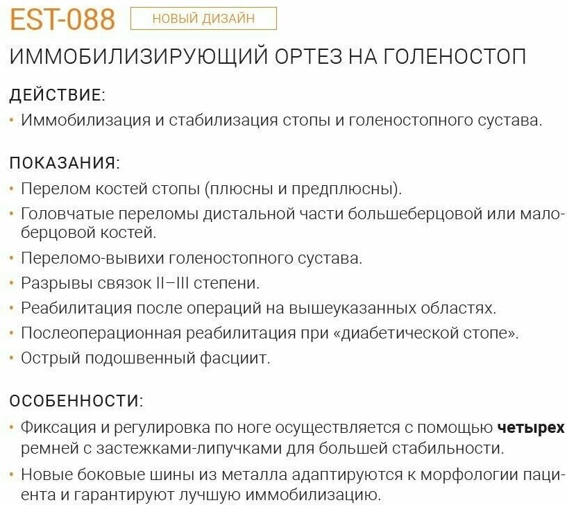 EST-088 ортез Действие: Иммобилизация и стабилизация стопы и голеностопного сустава Основные преимущества: Фиксация и регулировка по ноге осуществляется с помощью трех ремней с застежками-липучками. Высота ортеза 27 см. Вес от 1100 гр. до 1510 гр. в зависимости от размера. Дополнительные преимущества: В сравнении с применением гипсовой повязки, использование ортезов walkers ускоряет реабилитацию после травмы и минимизирует посттравматические осложнения, благодаря функциональным особенностям: Закругленная подошва обеспечивает плавный перекат при ходьбе, снимает часть нагрузки с травмированной конечности и влияет на восстановление патерна шага. Позволяет пациентам самостоятельно передвигаться на ранних этапах реабилитации. Полностью разъемный внутренний «валенок» позволяет безболезненно надевать ортез, даже при сильных отеках. В комплекте предусмотрены дополнительные уплотняющие пелоты для регулировки внутреннего объема и лучшей стабилизации ноги в ортезе и съемный защитный чехол для пальцев стопы. Резиновое покрытие подошвы обеспечивает устойчивость и защиту от скольжения. Показания: Перелом костей стопы (плюсны и предплюсны). Головчатые переломы дистальной части большеберцовой или малоберцовой костей. Переломо-вывихи голеностопного сустава. Разрывы связок II–III степени. Реабилитация после операций на вышеуказанных областях. Острый подошвенный фасциит. Послеоперационная реабилитация при «диабетической стопе». Подгонка ортеза данное изделие должно быть отрегулировано техником, либо. Для достижения большего терапевтического результата при различных отклонениях, а также для продления срока службы и эффективности изделия, необходимо подобрать правильный размер, подходящий пациенту (в комплекте прилагается таблица размеров с эквивалентом в сантиметрах). Повышенная компрессия может вызвать непереносимость, следовательно, рекомендуется подобрать оптимальные для Вас регулировки. A - Для размещения изделия надо учитывать следующие аспекты: Рекомендуется надевать ортез «walker» находясь в сидячем положении и положив ногу на ногу. На ногу следует надеть носок, желательно из хлопка. 1-Расстегните застежки-липучки «Велькро», чтобы отделить жесткую конструкцию от мягкого чехла, надеваемого на ногу. Наденьте мягкий чехол на ногу пациента, закрепив его с помощью системы застежек-липучек «Велькро». Разместите подушечку, защищающую пальцы. 2-После этого введите ногу в отрез. Убедитесь, что подошва ноги достигла опорной поверхности ортеза. (Если это сочлененная модель, то убедитесь, что среднебоковые пластины располагаются параллельно друг другу и на одинаковом расстоянии от линии нагрузки ноги и голеностопного сустава). Прикрепите жесткую структуру (или среднебоковые пластины, в случае сочлененной модели ортеза) к мягкому чехлу с помощью застежек-липучек «Велькро», которые расположены внутри конструкции.