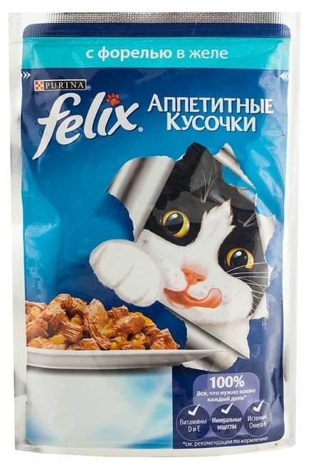 Корм для кошек PURINA Felix с форелью в желе Аппетитные кусочки - полноценный сбалансированный рацион домашнего питомца. Каждая порция содержит необходимые для здоровья вещества, имеет привлекательный для животных запах и вид.