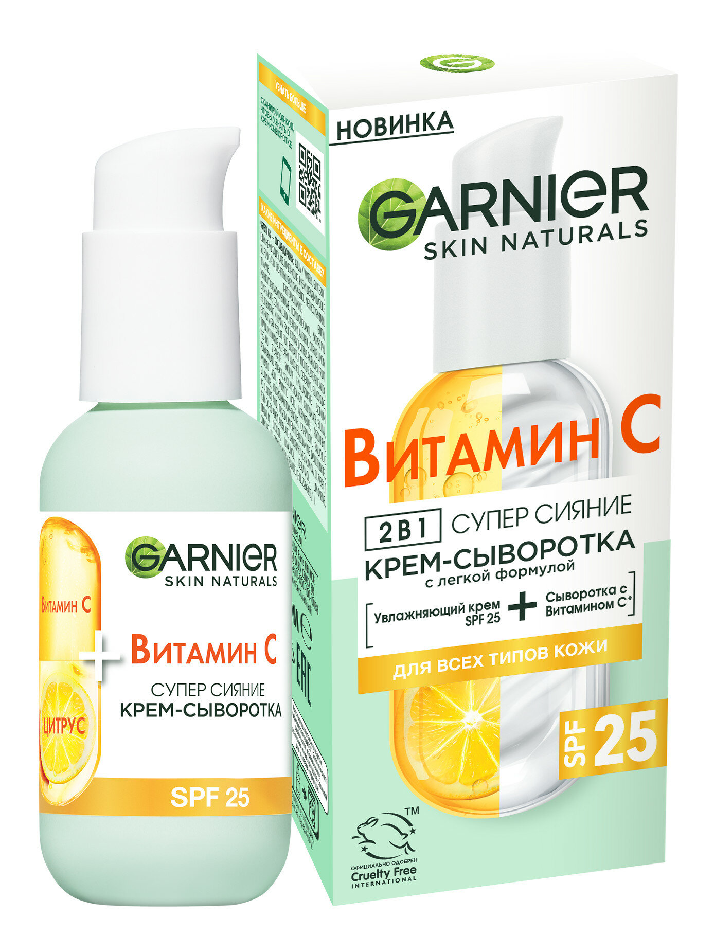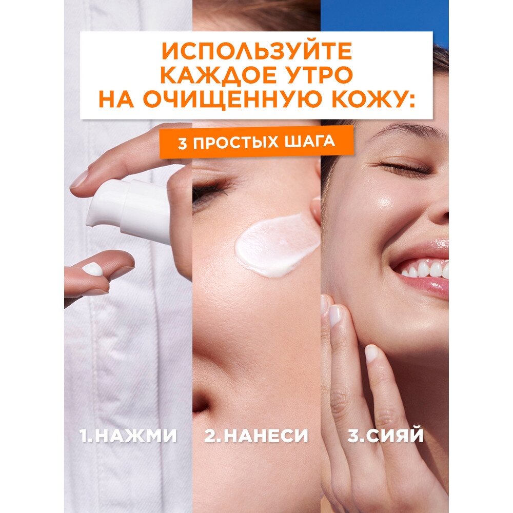 Новое поколение* средства для ухода: 2 в 1, насыщенное 20%-ной сывороткой, обогащенной Витамином С**. Крем-сыворотка с легкой формулой действует одновременно как сыворотка и как увлажняющий крем.