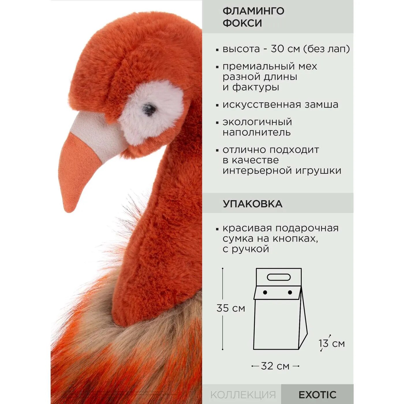Фламинго Фокси во всех смыслах яркий представитель коллекции мягких игрушек "Exotic", он с броским оперением насыщенного кораллового цвета и подойдет в качестве интерьерной игрушки для интересных современных пространств. Игрушка изготовлена из разнофактурных материалов превосходного качества - тело из длинноворсного плюша, шея и мордочка из мягкого коротковорсного плюша, а лапки и клюв из искусственной замши. Черные глазки в виде бусин. Фокси станет отличным подарком к любому празднику для ребенка или взрослого. Фламинго упакован в плотную прозрачную брендированную сумочку на кнопках, которая прекрасно подойдет в качестве подарочной упаковки. Высота игрушки в сидячем положении - 30 см. Игрушку можно стирать в щадящем режиме при температуре не более 30' и низких оборотах. Игрушка изготовлена из безопасных гипоаллергенных материалов. Товар сертифицирован.