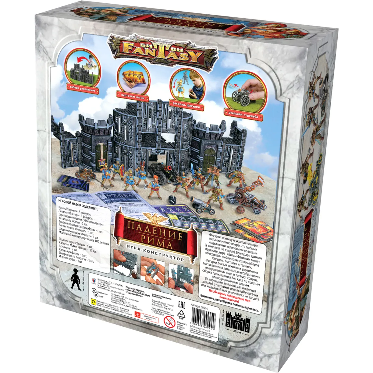 Игровой набор серии БФ "Падение Рима".Содержимое набора- отряд Викинги "Астерикс"- отряд Римляне "Юпитер"- стреляющее орудие Молот, Клоп, Бульдог и Дикобраз- большая крепость Скайтьюб- правила Ультра + карточки магии- схема сборки- армлисты и артефакты- кубикИгровые наборы «Битвы Fantasy» способствуют развитию зрительной памяти, логического мышления и фантазии, в игровой форме приучают к устному счету и внимательности, а также обучают навыкам общения со сверстниками и взрослыми.Фигурки и модели в наборах неокрашены, в виде отливок. Раскрасить их можно любыми акриловыми или модельными красками.
