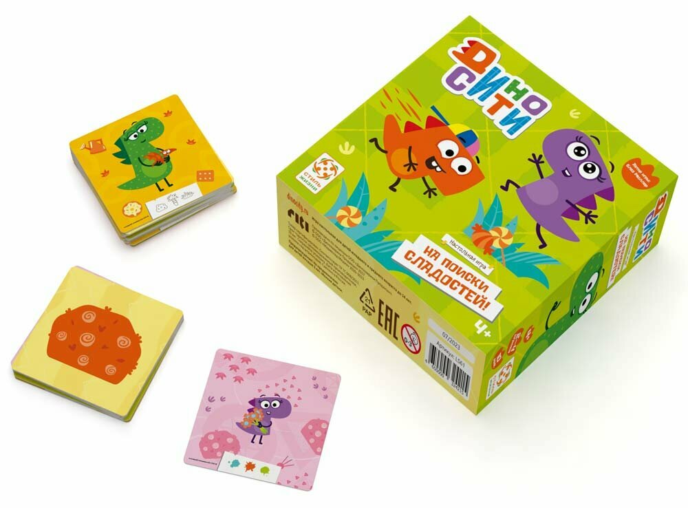 "ДиноСити" – это настольная игра на память. Двигаясь по тропинкам к сладостям, участники должны запоминать какие цвета и какие предметы изображены на лесных картах.Лес, в котором разворачиваются события настольной игры – это девять двусторонних карт, разложенных квадратом 3х3. На картах изображены разноцветные пальмы, кусты и трава. Цель игроков – как можно скорее добраться до противоположной стороны леса и завладеть конфетами. Загвоздка в том, что перейти через лес можно только если наизусть знаешь тропинку.Это простая, но увлекательная игра для всей семьи. В правилах предусмотрено несколько вариантов игры, чтобы усложнить или упростить процесс поиска конфет. А компактный размер позволит без труда взять ее в дорогу.В состав настольной игры входят: 9 двусторонних карт леса, 12 карт конфет, 4 карты завров и правила игры.