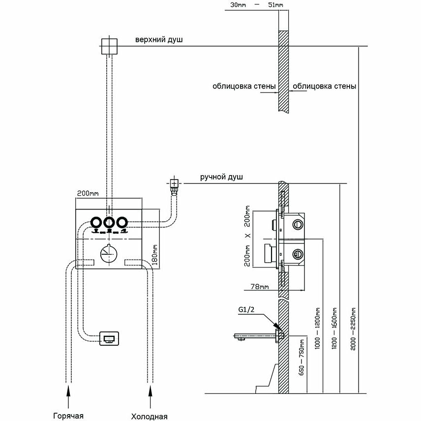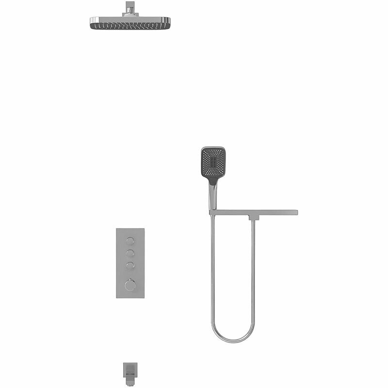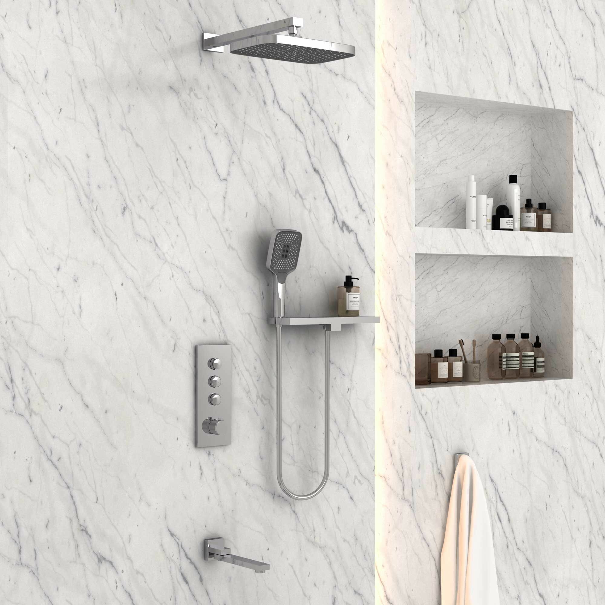 В комплете: Верхний душ, полка с изливом и держателем ручного душа, ручной душ, смеситель со встраиваемой частью.