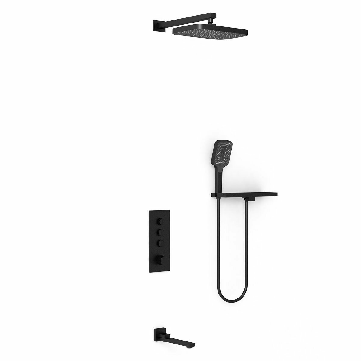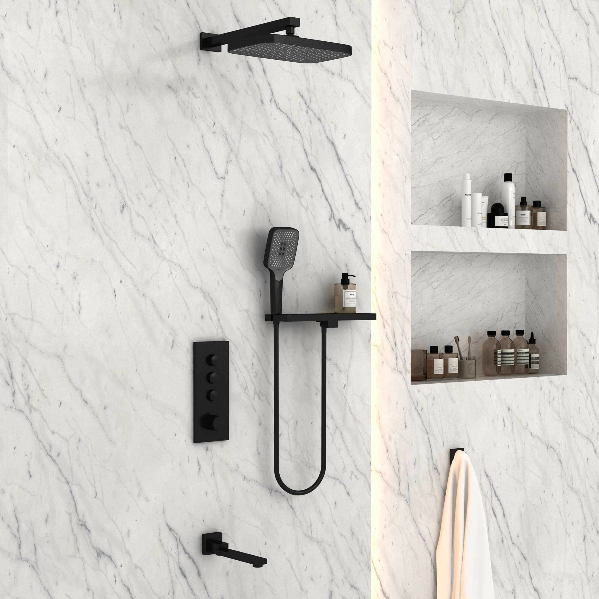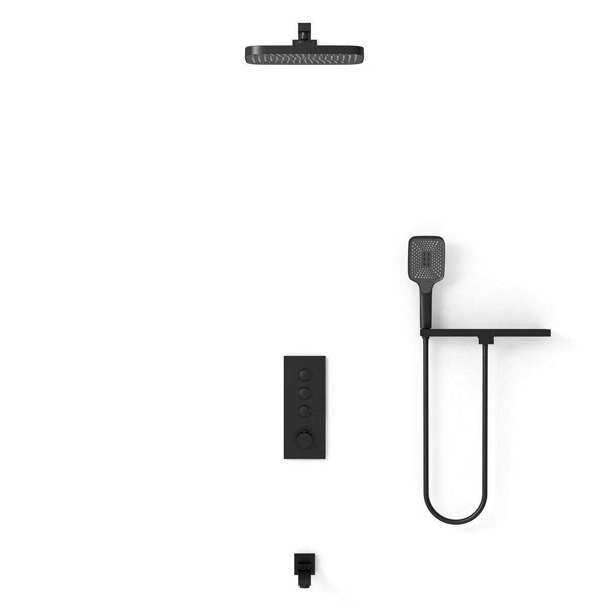 В комплете: Верхний душ, полка с изливом и держателем ручного душа, ручной душ, смеситель со встраиваемой частью.
