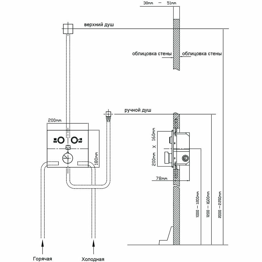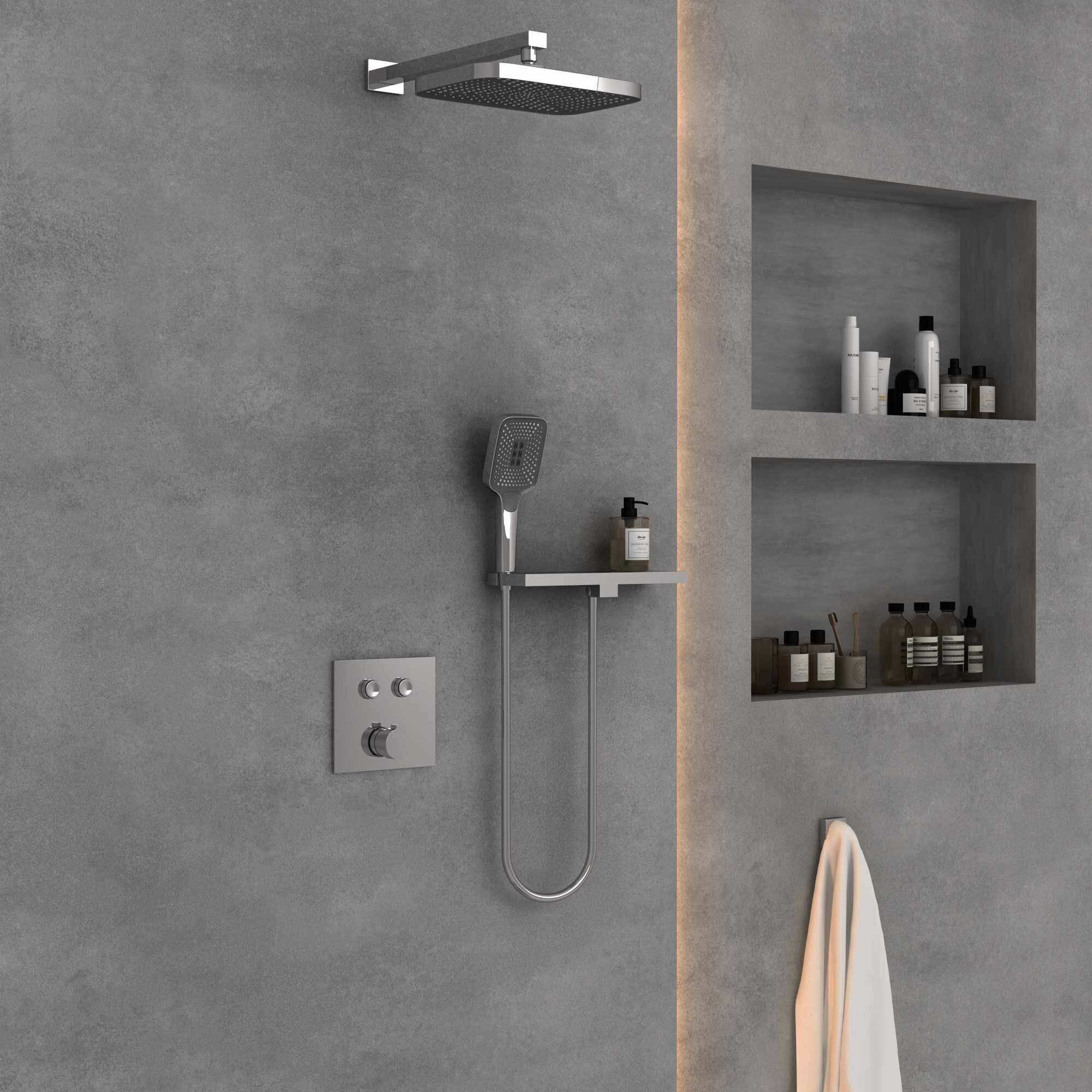 В комплекте: Верхний душ, полка с изливом и держателем ручного душа, ручной душ, смеситель со встраиваемой частью