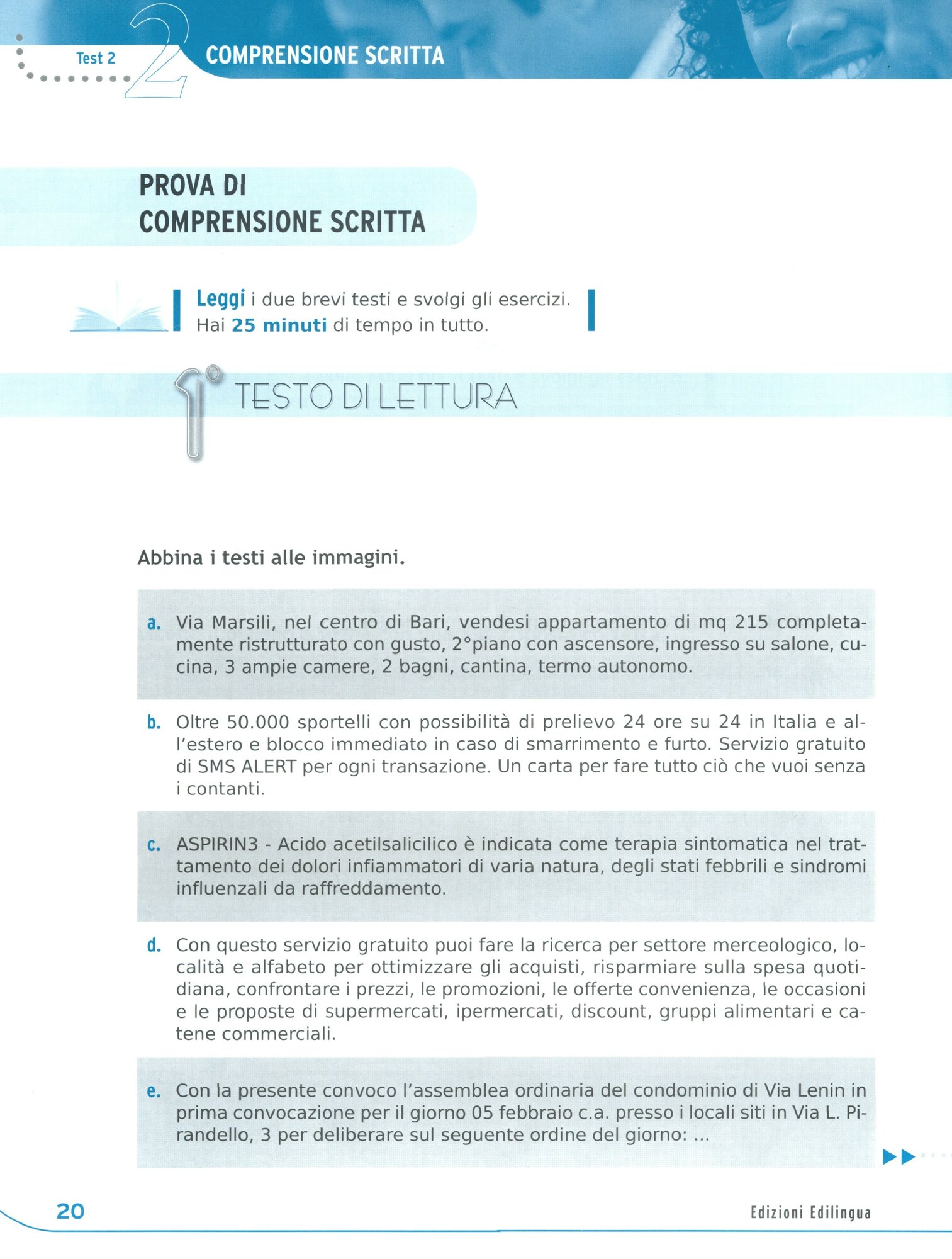 Comprensione scritta, due testi di lettura (scelta multipla, abbinamento, V/F).