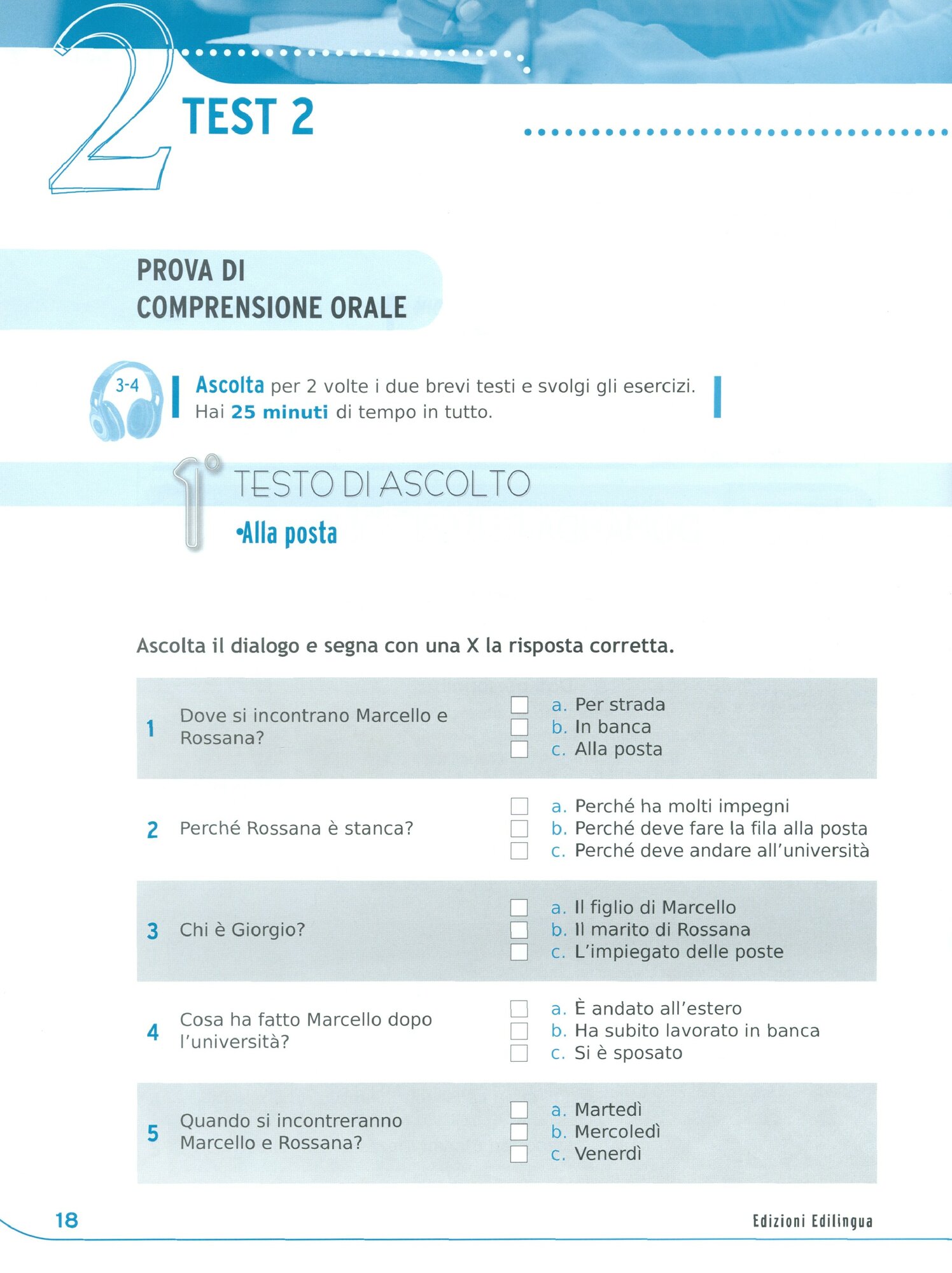 Comprensione orale, due testi di ascolto (scelta multipla, abbinamento, V/F).