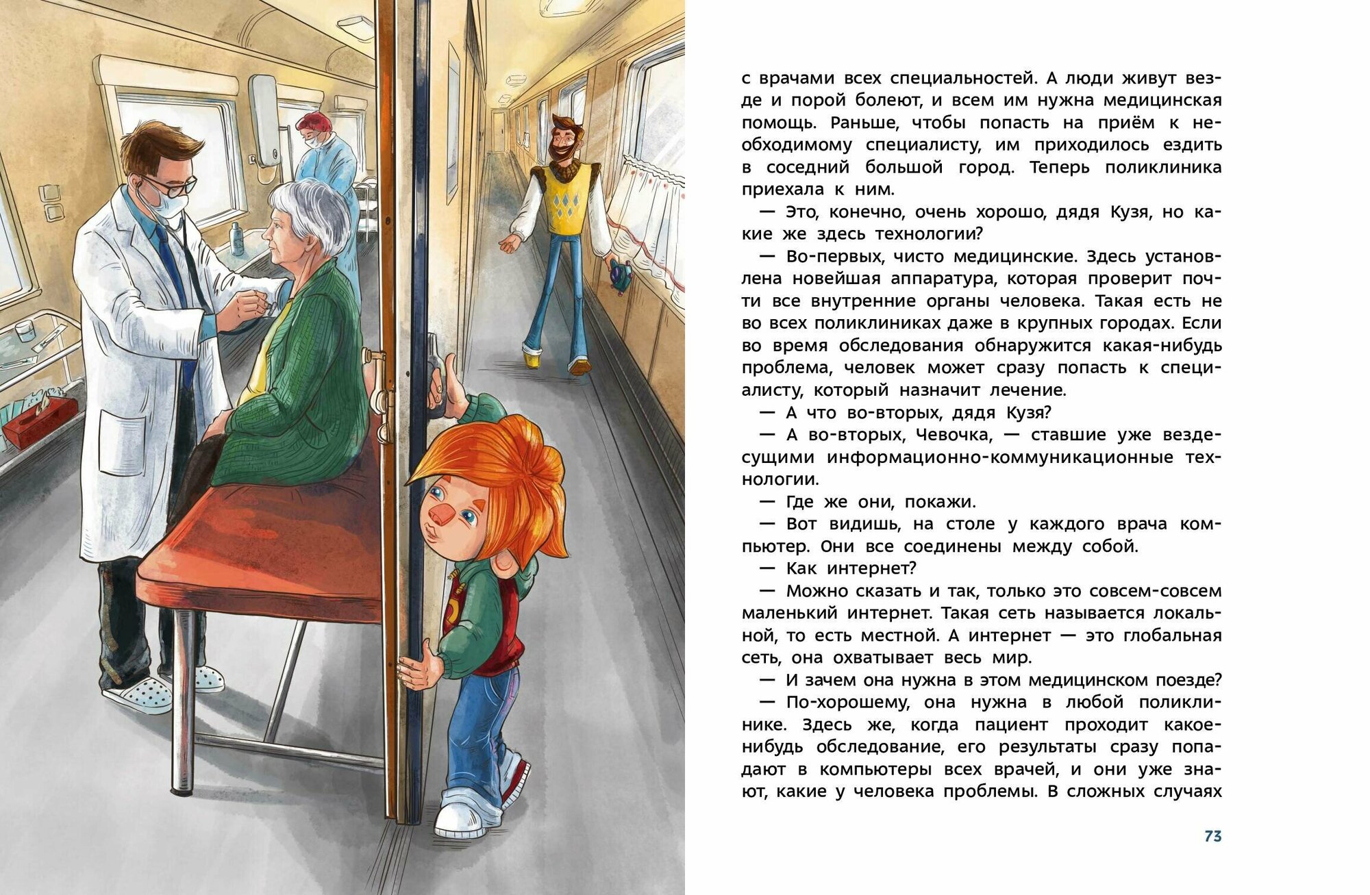 Откуда в наших домах берётся газ? Когда появился первый компьютер? Как работает мобильная связь? В новой книге серии детских энциклопедий Чевостик и дядя Кузя отправятся в необычное путешествие и узнают, что самые простые вещи, которые нас окружают, связаны со сложными технологиями. Они выяснят, откуда в кране появляется вода, а в лампочке — свет, как получают муку для изготовления хлеба и когда изобрели телефонную связь. А ещё герои побывают на металлургическом комбинате, где выплавляют сталь для производства автомобилей, и даже проедутся в медицинском поезде, оборудованном новейшими приборами. Кто такой Чевостик? Чевостик — симпатичный герой из известного аудиопроекта. Сегодня ребята знают его по энциклопедиям. В серии продолжают выходить книги, которые объясняют ребенку устройство мира. Дети гораздо лучше воспринимают информацию, когда о мире им рассказывает какой-нибудь сказочный персонаж. Именно поэтому девчонки и мальчишки так любят подобные энциклопедии. Чевостик вместе с дядей Кузей совершает удивительные путешествия в мир наук: физики, химии, астрономии, анатомии, геологии и других. Он рассказывает детям о великих географических открытиях, покорении космоса и волшебных химических превращениях. Для кого эта книга Для любознательных детей от 6 лет. Для всех-всех фанатов Чевостика. Для дошкольников и младших школьников.