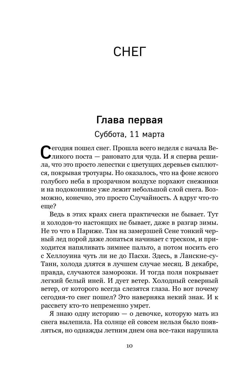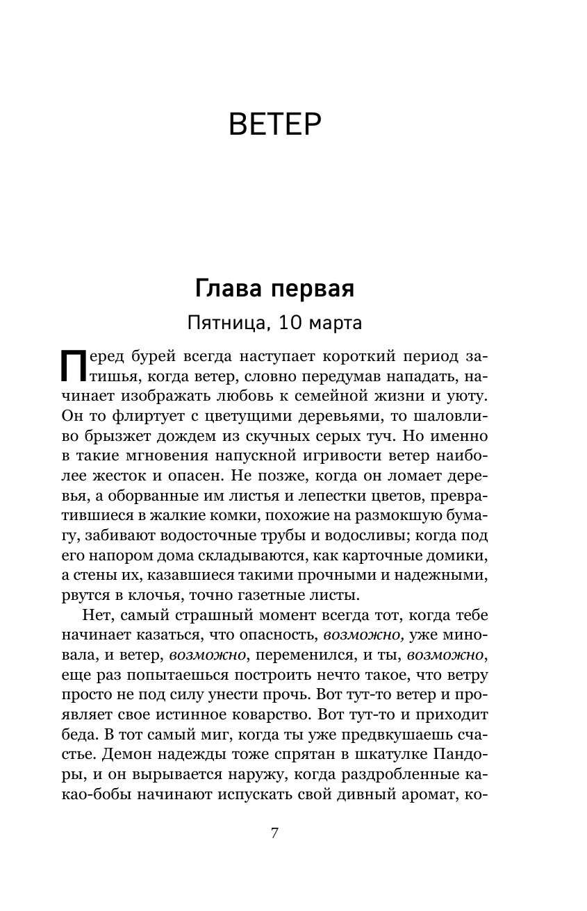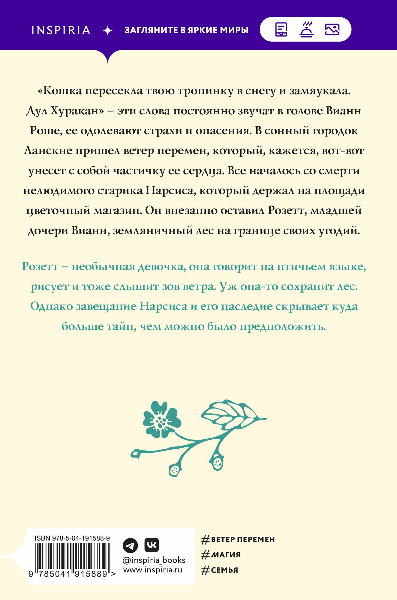 «Кошка пересекла твою тропинку в снегу и замяукала. Дул Хуракан» - эти слова постоянно звучат в голове Вианн Роше, ее одолевают страхи и опасения. В сонный городок Ланскне пришел ветер перемен, который, кажется, вот-вот унесет с собой частичку ее сердца. Все началось со смерти нелюдимого старика Нарсиса, который держал на площади цветочный магазин. Он внезапно оставил Розетт, младшей дочери Вианн, земляничный лес на границе своих угодий. Розетт – необычная девочка, она говорит на птичьем языке, рисует и тоже слышит зов ветра. Уж она-то сохранит лес. Однако завещание Нарсиса и его наследие скрывает куда больше тайн, чем можно было предположить.
