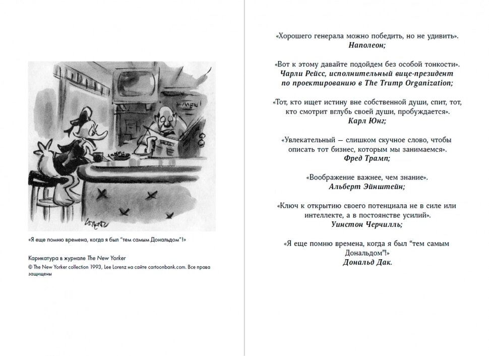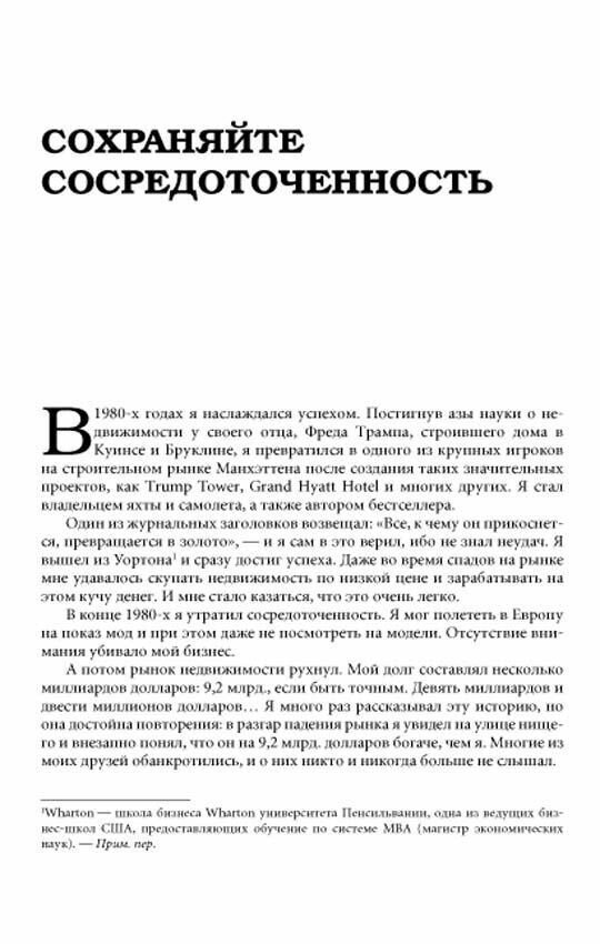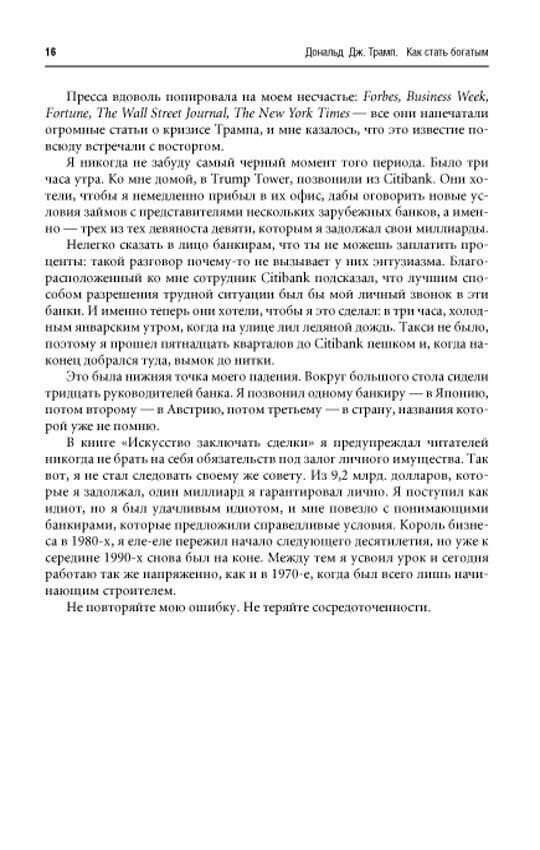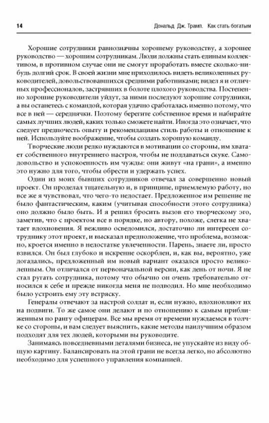 Старая книжка-мотиватор, написанная не совсем Трампом, но изданная от его имени. В книге даются дельные советы по ведению бизнеса по-американски. Советы понятные, где-то банальные, но читать их как инструкцию вызывает интерес. Стиль написания простой, ясный, не запутанный, но в то же время не шедевральный. В общем, книга пойдёт всем тем, кто интересуется бизнесом и психологией влияния.