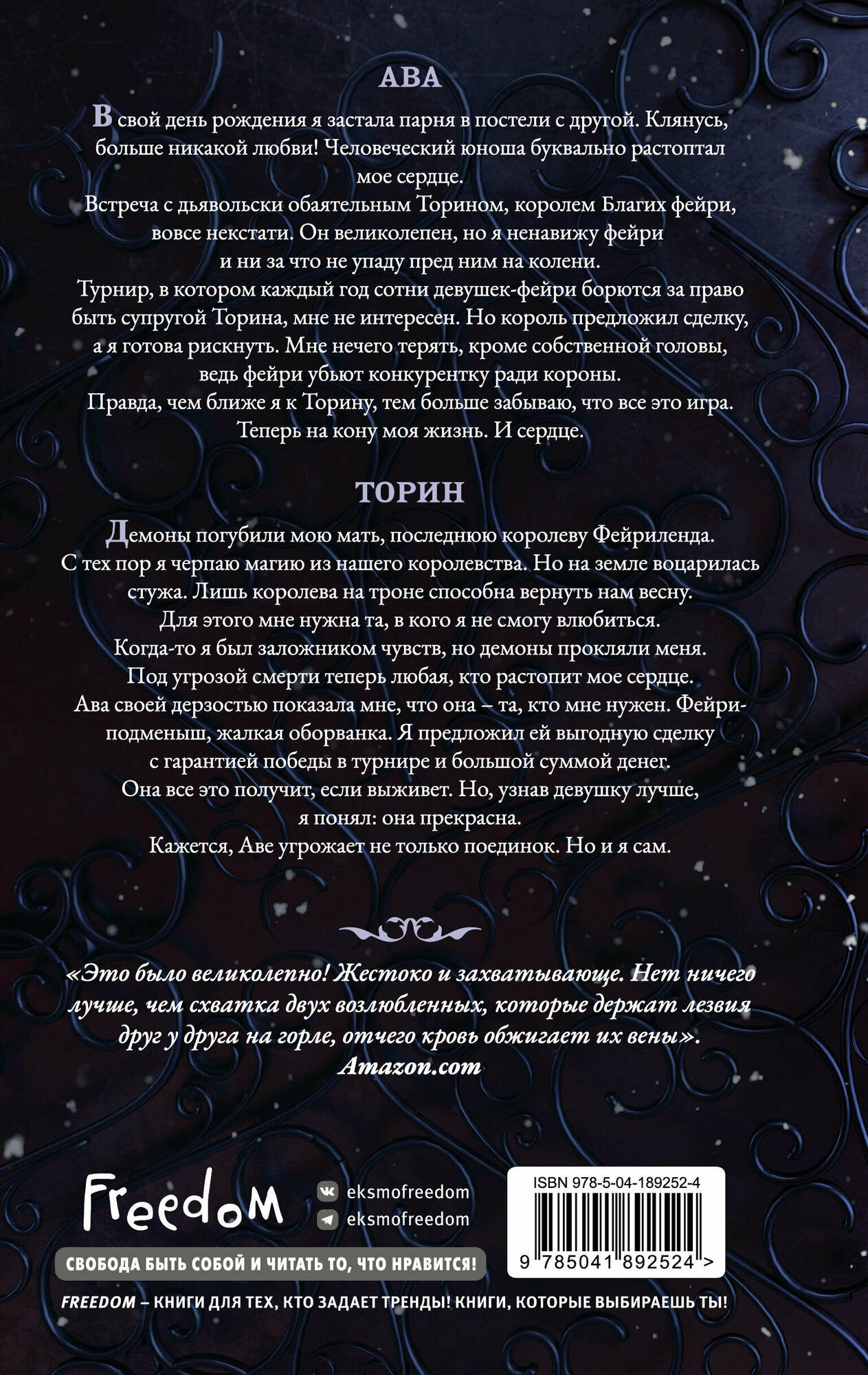 АВА В свой день рождения я застала парня в постели с другой. Клянусь, больше никакой любви! Человеческий юноша буквально растоптал мое сердце. Встреча с дьявольски обаятельным Торином, королем Благих фейри, вовсе некстати. Он великолепен, но я ненавижу фейри, и ни за что не упаду пред ним на колени. Турнир, в котором каждый год сотни девушек-фейри борются за право быть супругой Торина, мне не интересен. Но король предложил сделку, а я готова рискнуть. Мне нечего терять, кроме собственной головы, ведь фейри убьют конкурентку ради короны. Правда, чем ближе я к Торину, тем больше забываю, что все это игра. Теперь на кону моя жизнь. И сердце. ТОРИН Демоны погубили мою мать, последнюю королеву Фейриленда. С тех пор я черпаю магию из нашего королевства. Но на земле воцарилась стужа. Лишь королева на троне способна вернуть нам весну. Для этого мне нужна та, в кого я не смогу влюбиться. Когда-то я был заложником чувств, но демоны прокляли меня. Под угрозой смерти теперь любая, кто растопит мое сердце. Ава своей дерзостью показала мне, что она – та, кто мне нужен. Фейри-подменыш, жалкая оборванка. Я предложил ей выгодную сделку с гарантией победы в турнире и большой суммой денег. Она все это получит, если выживет. Но, узнав девушку лучше, я понял: она прекрасна. Кажется, Аве угрожает не только поединок. Но и я сам.