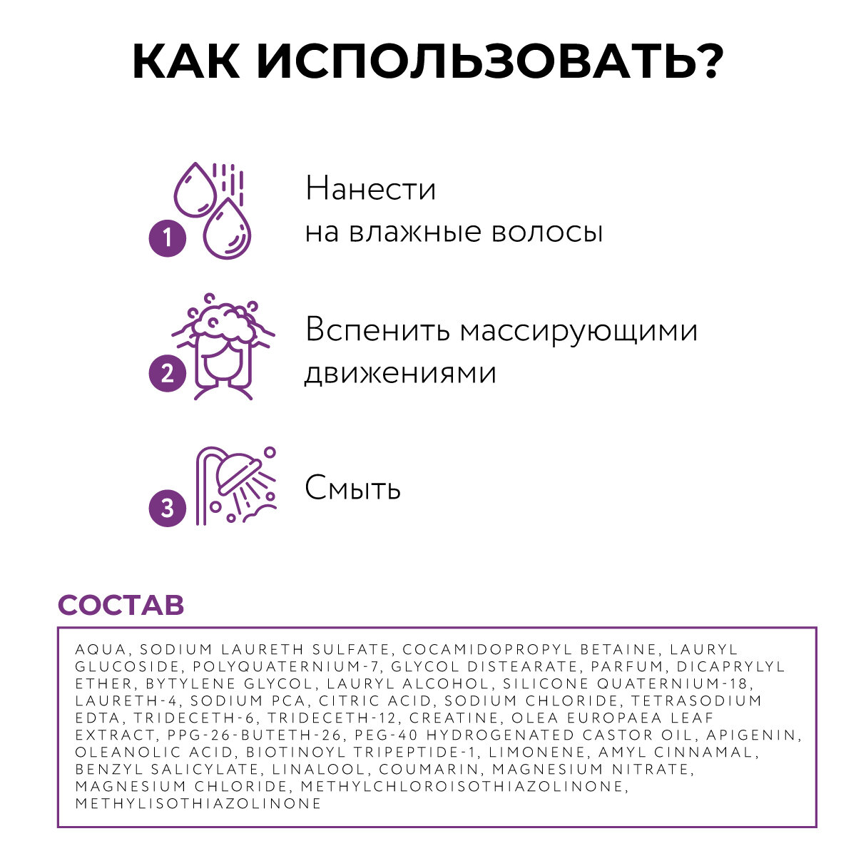 | Химический состав | Aqua, Sodium Laureth Sulfate, Cocamidopropyl Betaine, Lauryl Glucoside, Polyquaternium-7, Glycol Distearate, Parfum, Dicaprylyl Ether, Bytylene Glycol, Lauryl Alcohol, Silicone Quaternium-18, Laureth-4, Sodium PCA, Citric Acid, Sodium chloride, Tetrasodium EDTA, Trideceth-6, Trideceth-12, Creatine, Olea Europaea Leaf Extract, PPG-26-Buteth-26, PEG-40 Hydrogenated Castor Oil, Apigenin, Oleanolic Acid, Biotinoyl Tripeptide-1, Limonene, Amyl Cinnamal, Benzyl Salicylate, Linalool, Coumarin, Magnesium nitrate, Magnesium chloride, Methylchloroisothiazolinone, Methylisothiazolinone. |