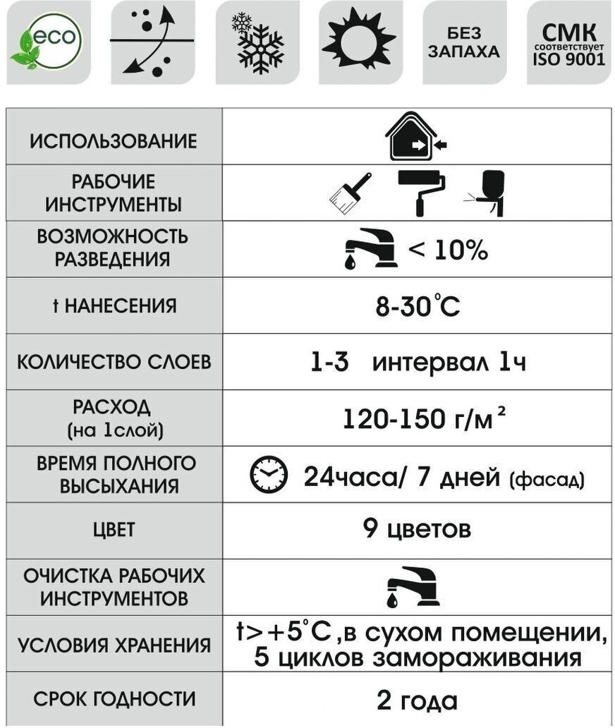 | Состав | Акриловая дисперсия, вода, диоксид титана, целевые добавки. |