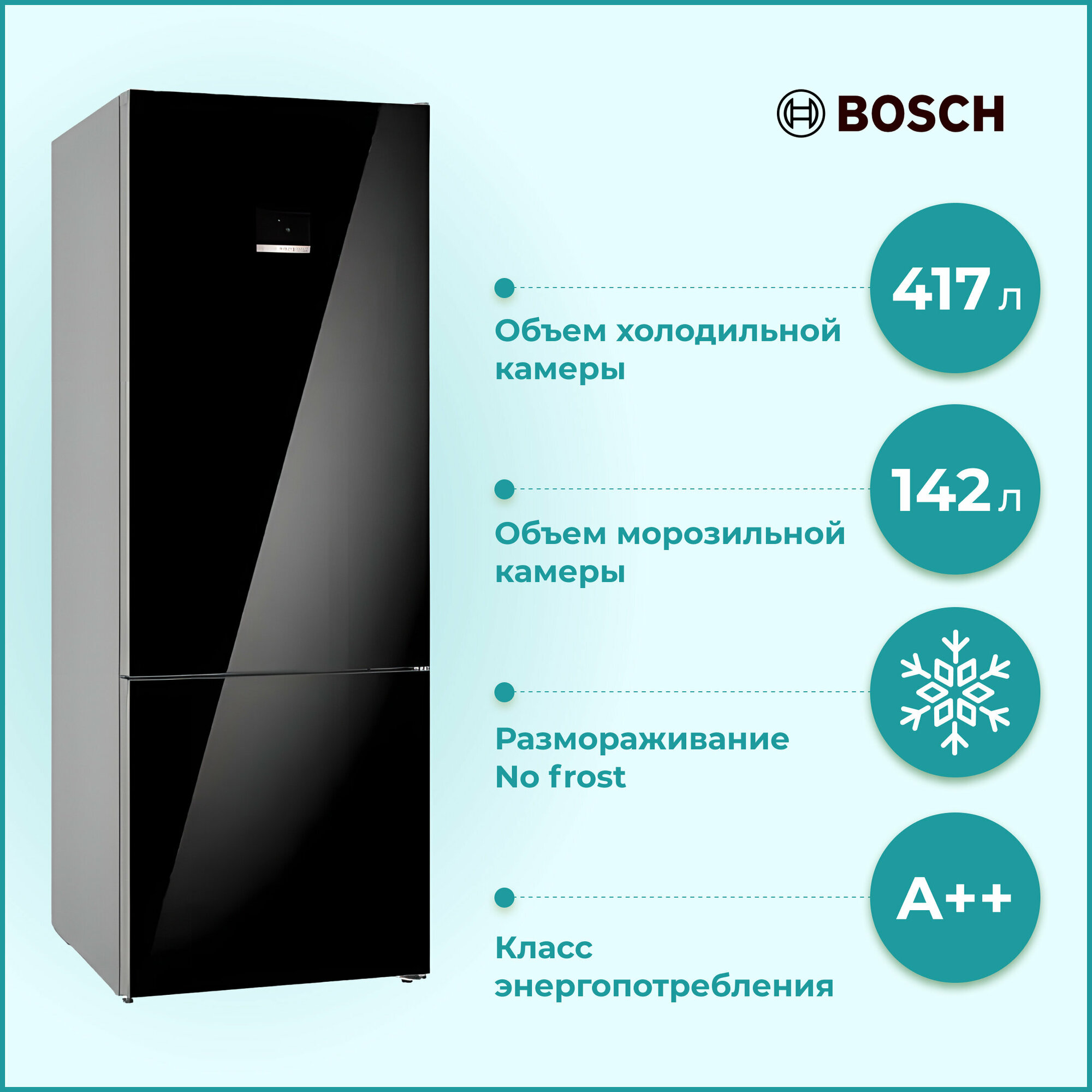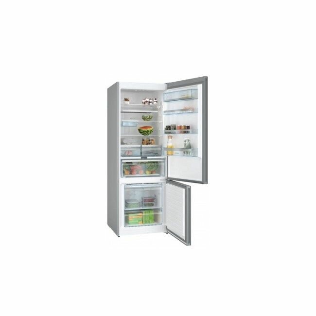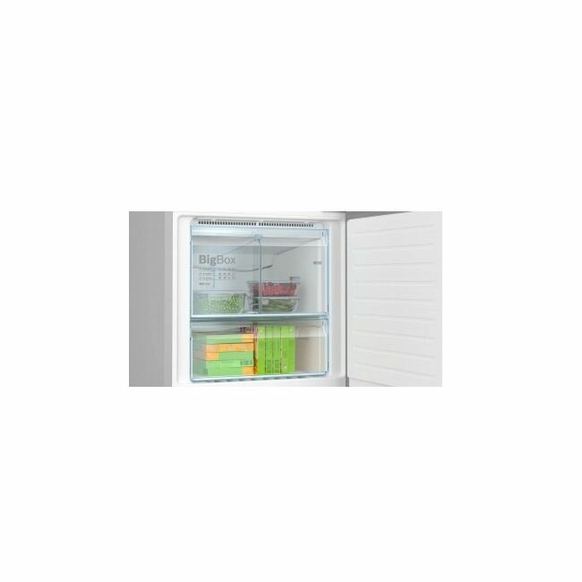 Двухкамерный холодильник Bosch высотой 193 см и шириной 70 см имеет общий полезный объем 505 литров, из них холодильная камера - 400 л, морозильная камера - 105 л. Управление осуществляется с помощью сенорной панели на дверце холодильника, выбранные настройки отображаются на LCD-дисплее. Холодильники Bosch VitaFresh оснащены ярким и равномерным светодиодным освещением холодильной камеры. Технология NoFrost предотвращает образование инея и льда в морозильном отделении и снижает уровень потребления энергии. Датчики FreshSense постоянно контролируют и поддерживают температуру в холодильном и морозильном отделениях. Система MultiAirflow с помощью вентилятора подает равномерные потоки охлажденного воздуха на все уровни холодильного и морозильного отделений. Зона свежести VitaFresh Plus предназначена для хранения разных продуктов в идеальных условиях с оптимальными настройками температуры (около 0°C). Ящик BigBox позволит хранить самые объемные продукты, например целую индейку.