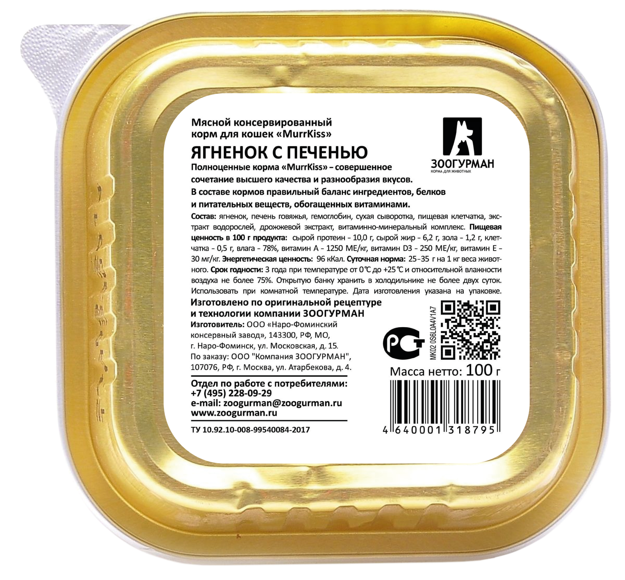 Корм для кошек "Murr Kiss" ягненок с печенью 100 г Зоогурман