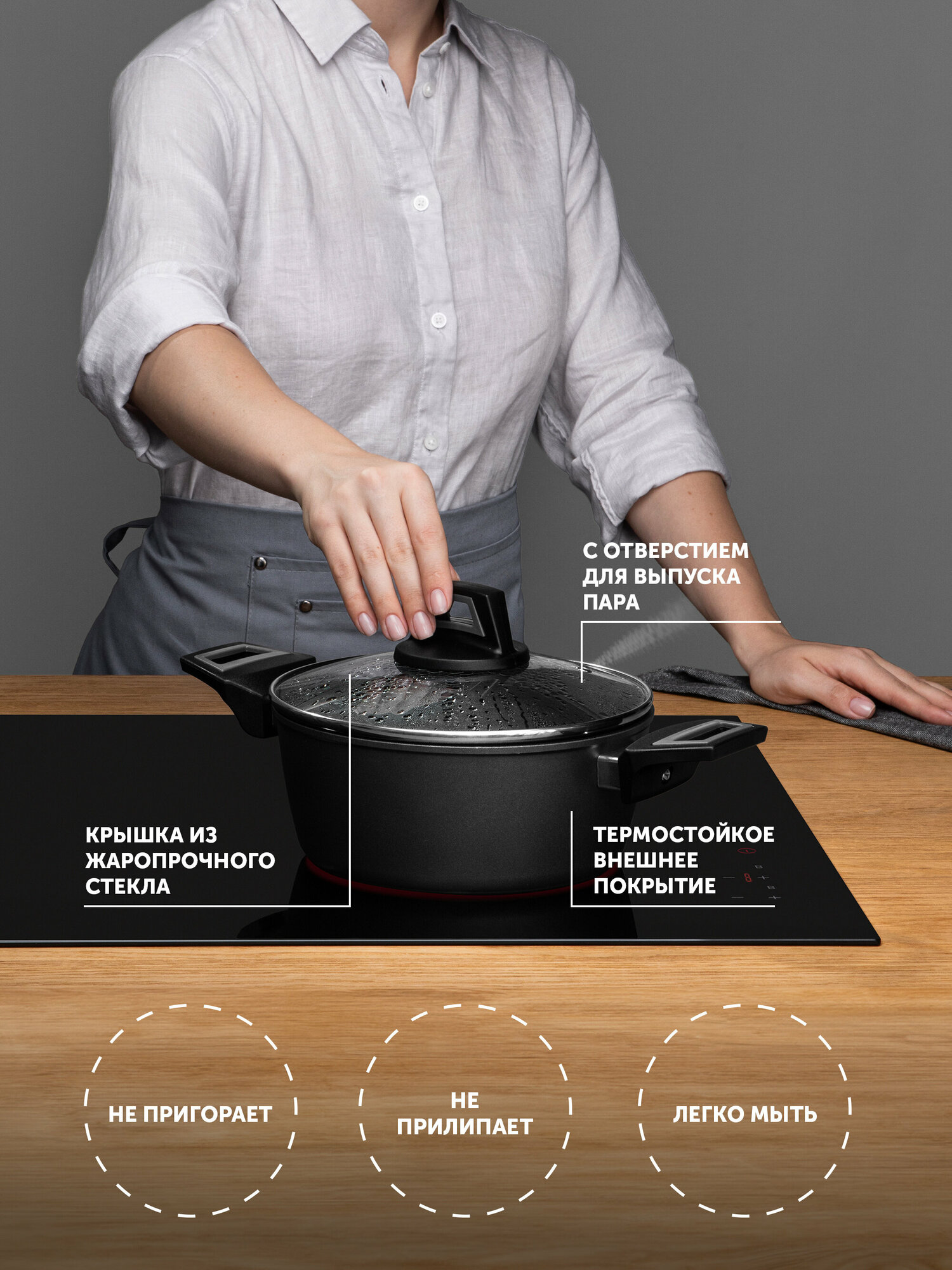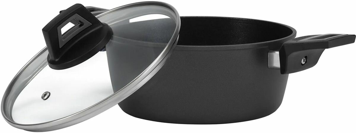 Стеклянная крышка оснащена отверстием для выпуска пара. Она позволяет контролировать процесс приготовления, сохраняя аромат и питательные вещества внутри кастрюли. Эргономичные бакелитовые ручки с покрытием soft touch обеспечивают удобство и комфорт при использовании кастрюли.