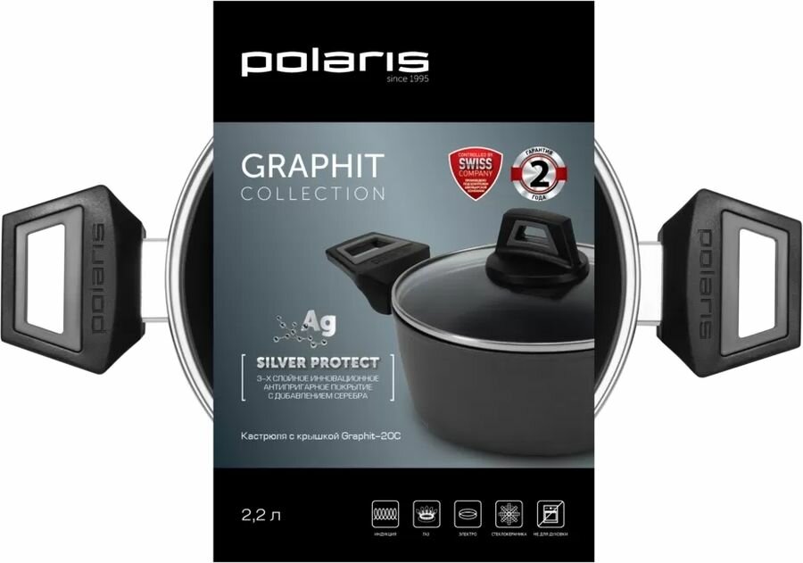 Кастрюля Polaris может использоваться в сочетании со сковородами серии Graphit для приготовления различных вторых блюд. Серия Graphit состоит из: кастрюли 4,4 л., кастрюли 2,2 л., ковша 1,6 л., сковород на 28 см, 26 см, 24 см, 20 см. Таким образом, вы можете собрать набор кастрюль и сковород надежного качества и утонченного дизайна от Polaris. Приобретайте качественную антипригарную посуду для кухни Polaris и сделайте кулинарные эксперименты еще более удобными и приятными!