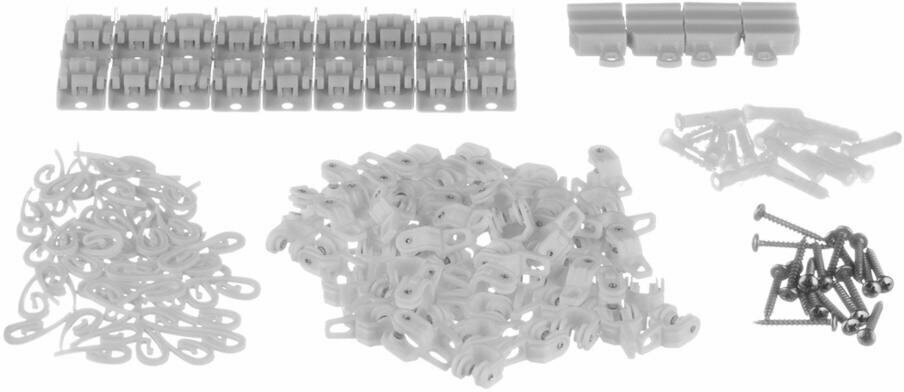 | Состав комплекта | Гибкий профиль 1 шт, бегунки-ролики 60 шт, крючки 60 шт, заглушки 4 шт, кронштейн 16 шт, дюбель 16 шт, шуруп 16 шт. |