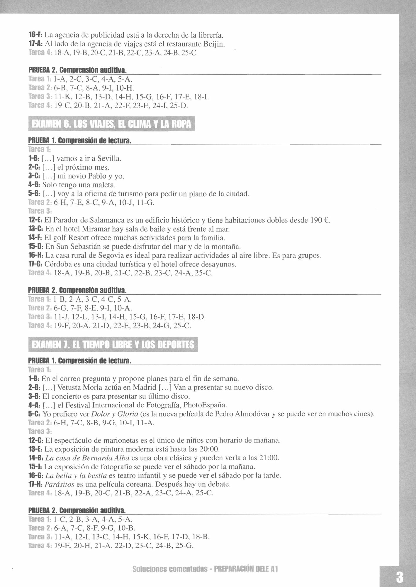 Las soluciones comentadas: en la prueba 1, Comprension de lectura, Tareas 1 y 3, se justifica la respuesta correcta con la frase correspondiente del texto o con una aclaracion.