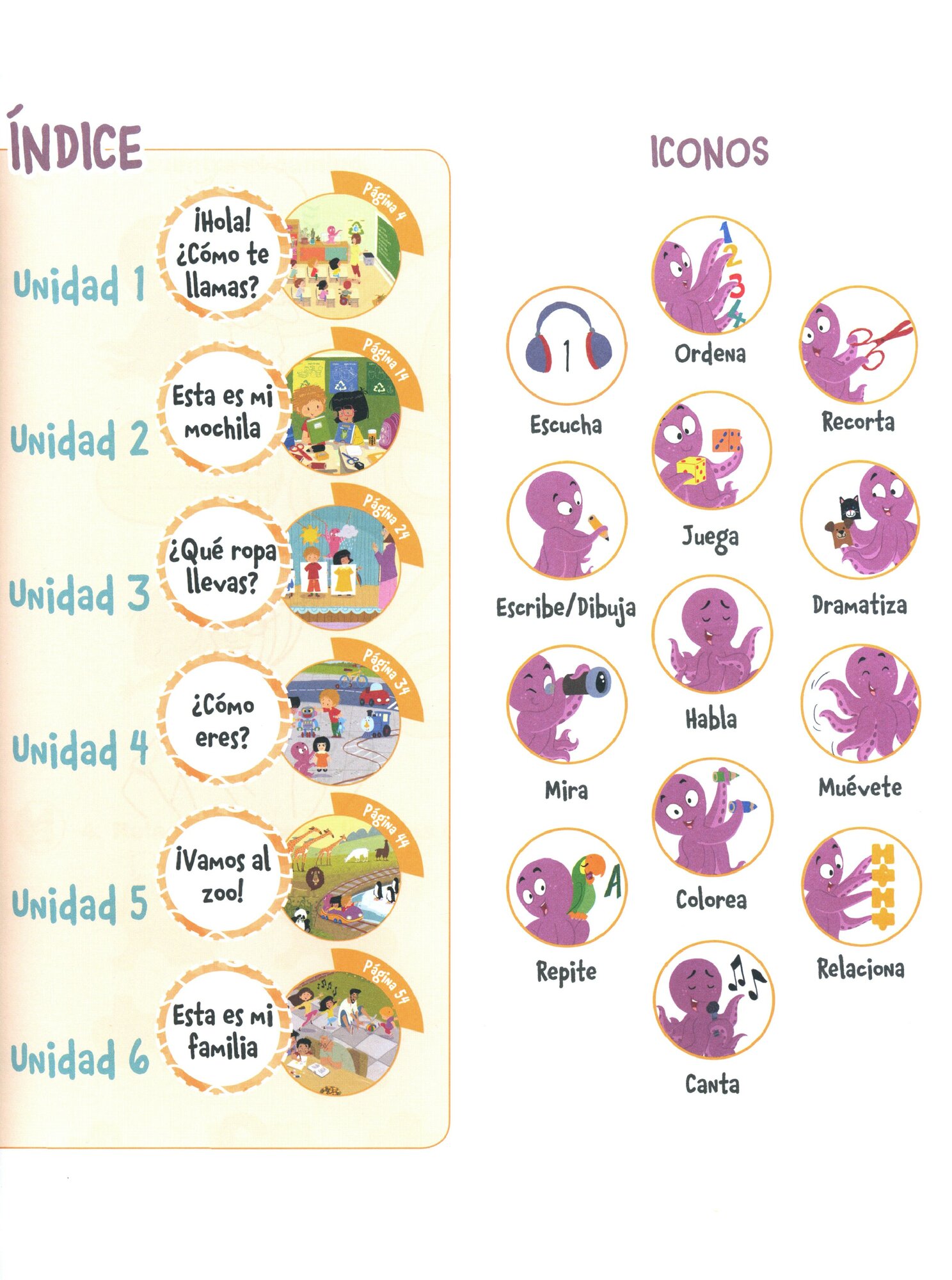 El libro del alumno consta de 6 unidades tematicas relacionadas directamente con los centros de interes del nino en su entorno proximo.