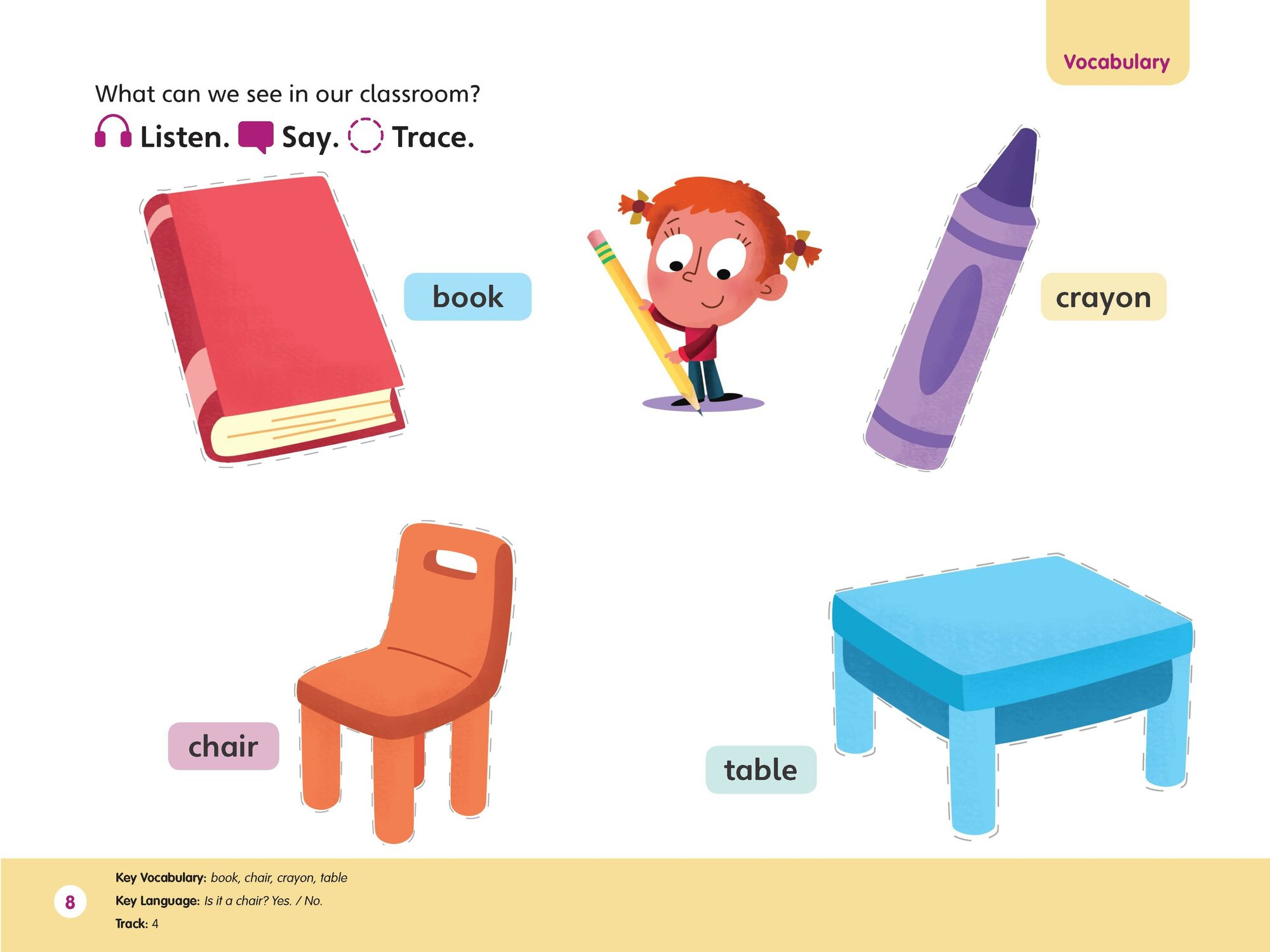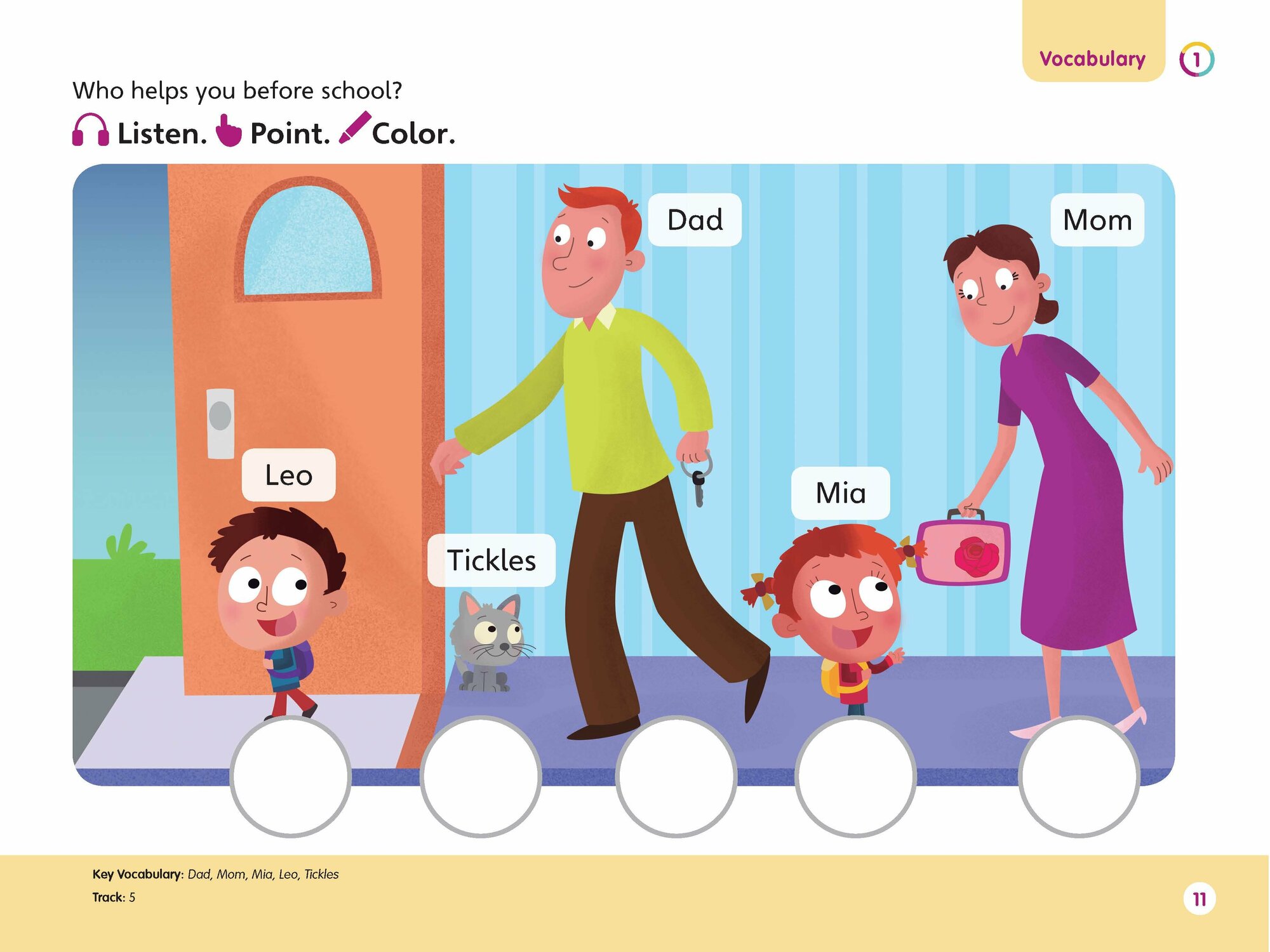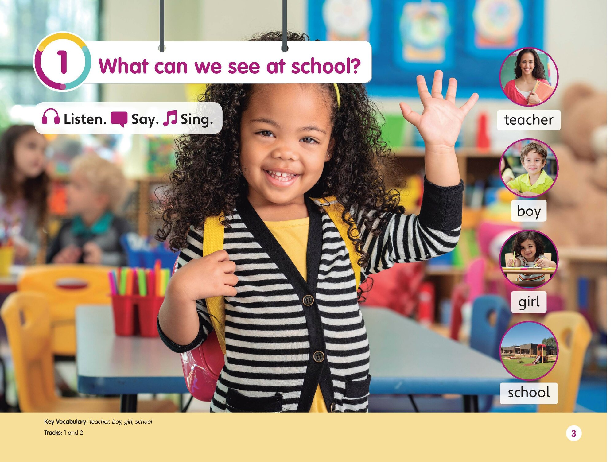 - Предварительные и начальные уроки грамотности, по два урока словарного запаса на раздел и урок счета;